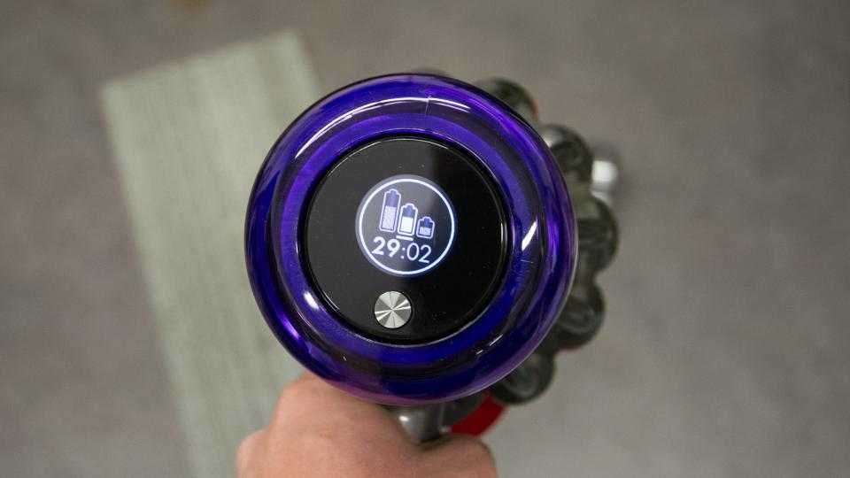 И чтобы дать вам лучшее представление о том, сколько времени у вас осталось, Дайсон включил небольшой ЖК-дисплей на задней стороне ручки V11. Он показывает точное количество оставшихся минут и секунд, дает советы о том, как устранить блокировки, когда они возникают, и указывает режим, который вы используете. Это гораздо более совершенная система, чем простые светодиоды V10 для зарядки аккумулятора.