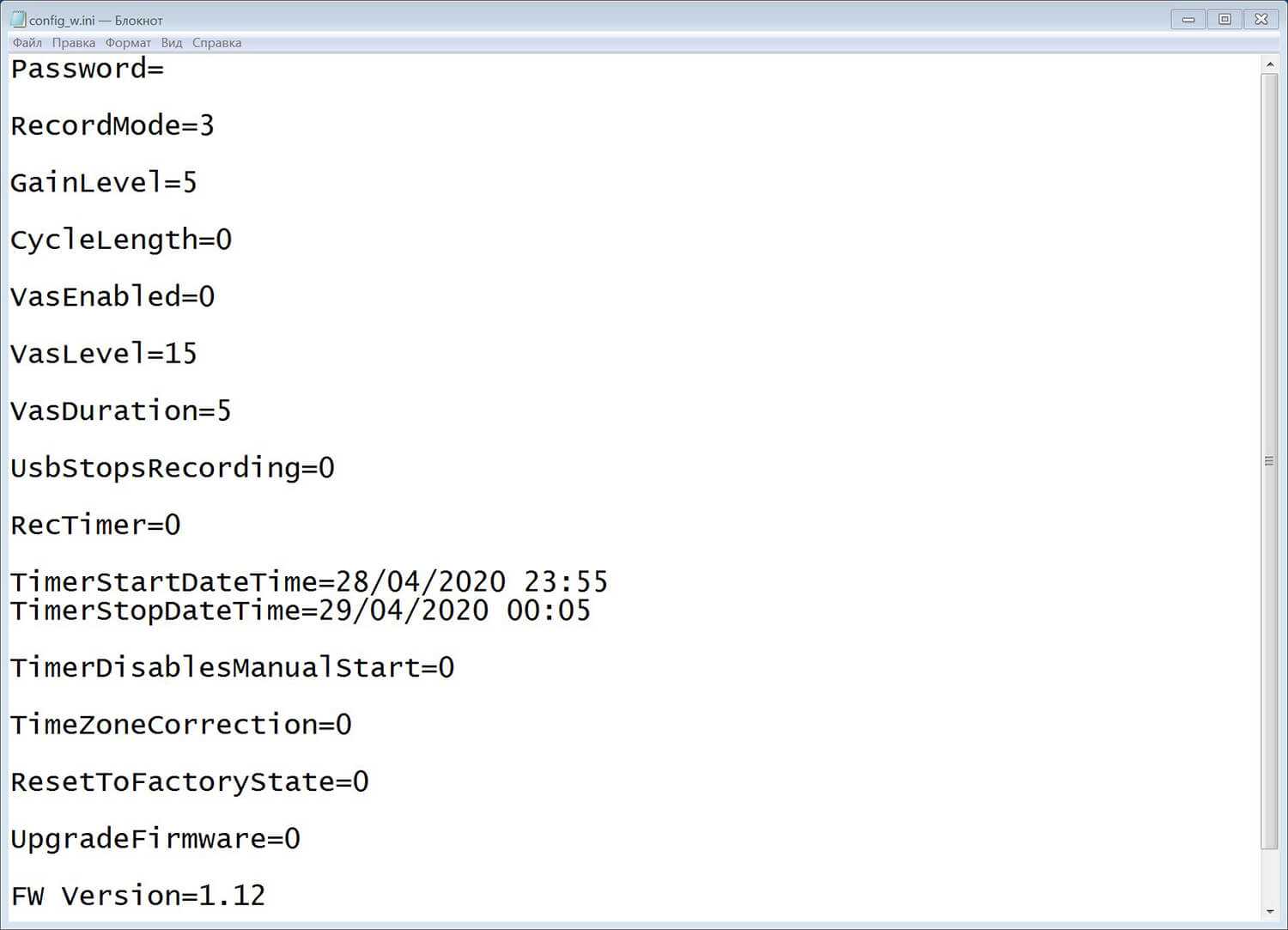 Чтобы никто не мог воспользоваться данными и перенастроить диктофон, вендор предусмотрел возможность защитить его паролем. Пароль устанавливается как значение параметра Password. Казалось бы, нет ничего проще, чем открыть файл и поменять значение. Но все не так просто.