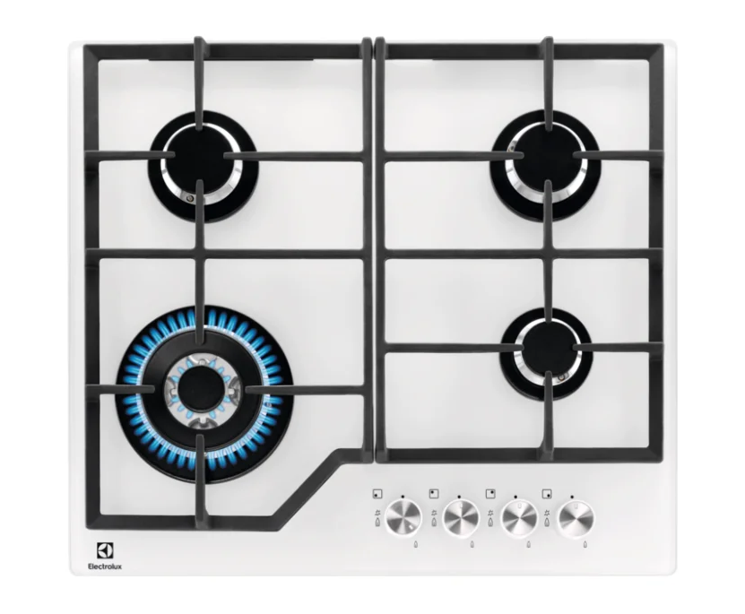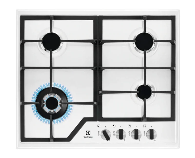Ещё одна популярная варочная панель Electrolux из той же серии. Главное отличие GPE 363 YV от предыдущей модификации заключается в применении стеклокерамической панели белого цвета. Устройство отличается простой установкой, набором из 4 конфорок, опцией газ-контроля, а также автоматическим поджигом. В отзывах варочную поверхность хвалят за прочное покрытие. Действительно, повредить стеклокерамику очень сложно. Единственную опасность для данного материала представляют сильные удары. Но благодаря массивной чугунной решётке повредить варочную панель Electrolux практически невозможно.