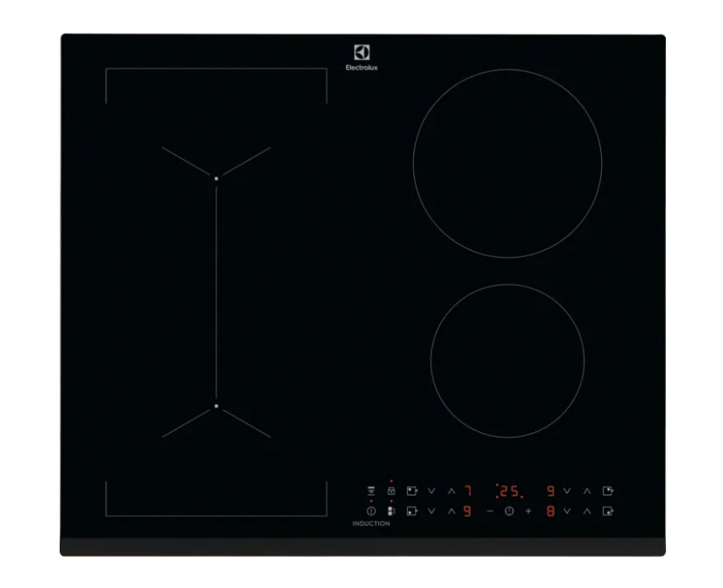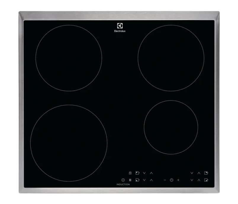 Индукционная варочная панель Электролюкс с рамкой по периметру. Устройство хорошо собрано и быстро нагревает воду за счёт высокой мощности конфорок (суммарная 7,35 Вт). Самая маленькая область нагрева здесь имеет размер 14,5 см. Также на панели есть две средних 18-сантиметровых конфорки и одна крупная диаметром 21 см.
