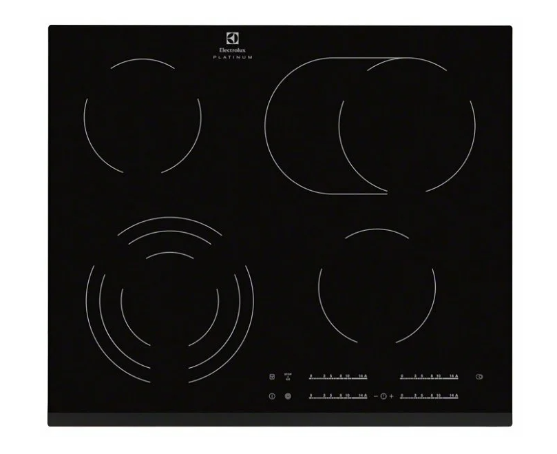 Нет, функцией мультиварки компания Electrolux поверхность не наделила. Зато кроме двух небольших конфорок диаметром 14,5 см каждая здесь есть по одной тройной и овальной. Первая, как понятно из названия, может регулироваться (диаметр 12, 17,5 или 21 см). Вторая имеет стандартный диаметр 17 см, но может расширяться в длину до 26,5 см.