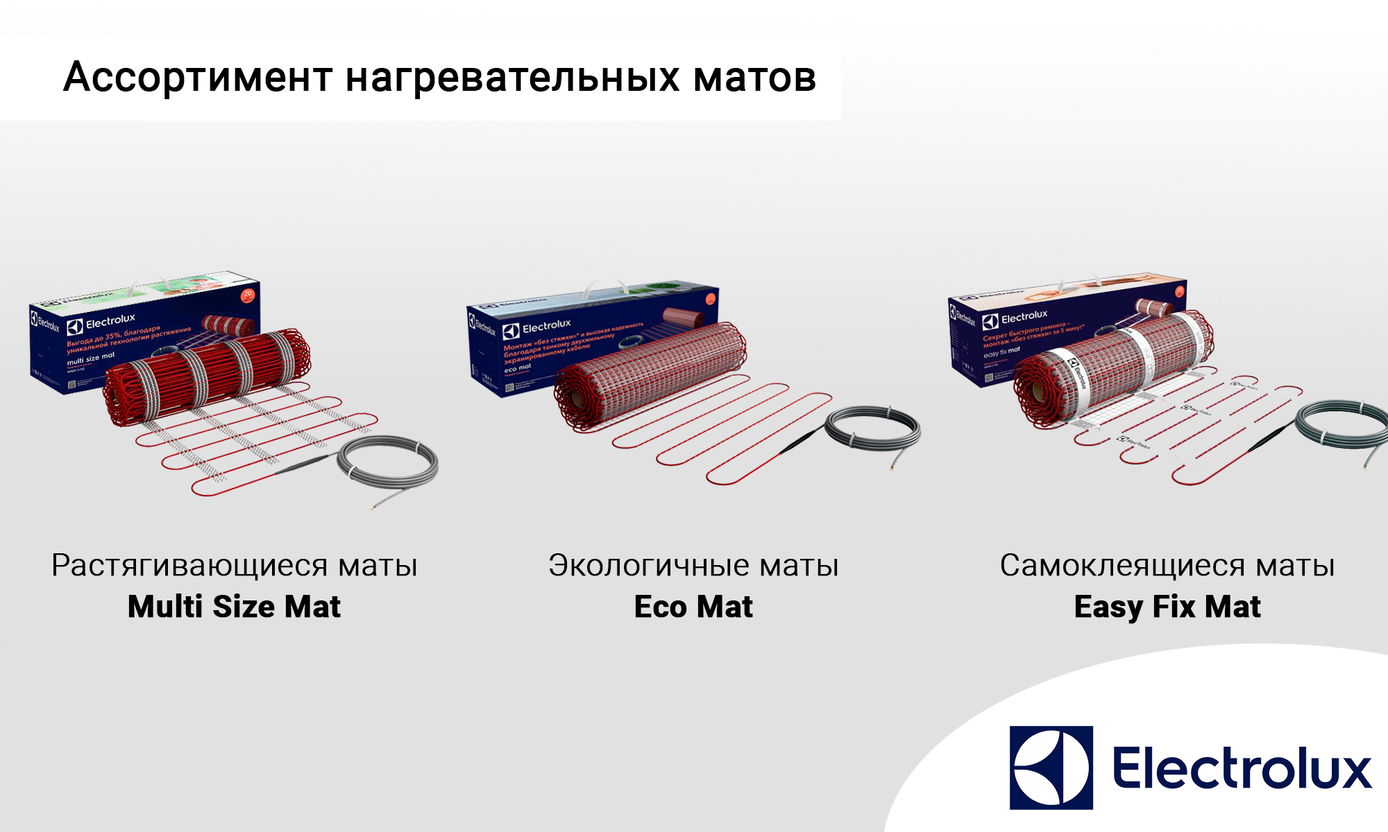 - Теплый пол мат Electrolux укреплен сверхпрочной арамидной нитью. Они дополнены фторопластовой, поясной и внешней оболочкой, потому устойчивы к повышенным нагрузкам, не подвержены изломам, разрыву и истиранию.