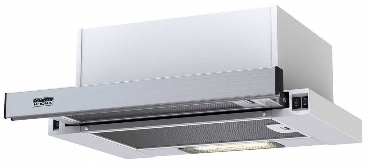 В рейтинге малошумных встраиваемых кухонных вытяжек нужно отметить Krona Kamilla. Устройство с выдвижной панелью оснащено фильтрами жира, антивозвратным клапаном и двумя галогенными лампами. Управление механическое, устойчивое к износу, средний срок службы приспособления составляет семь лет.