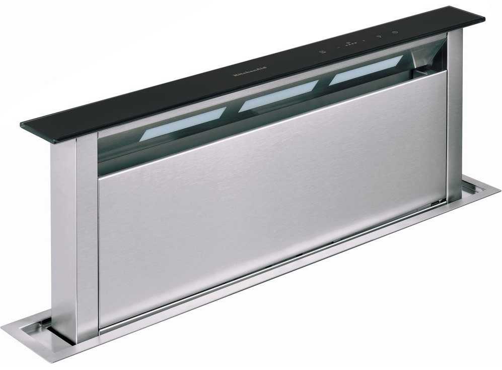 Стильный лаконичный дизайн — не единственное преимущество этой техники. Благодаря двум вентиляторам устройство быстро и качественно удаляет даже стойкие запахи (к примеру, от жареной рыбы). Кнопки переключения мощности скрыты при закрытом виде вытяжки.