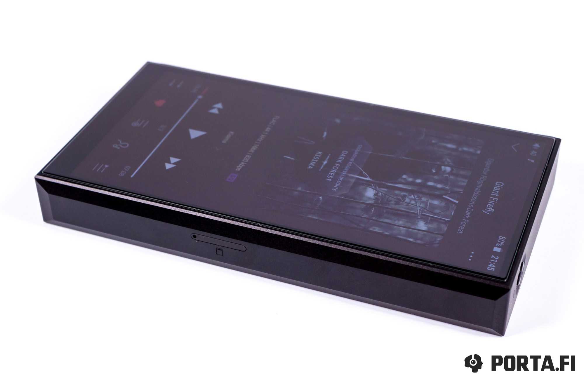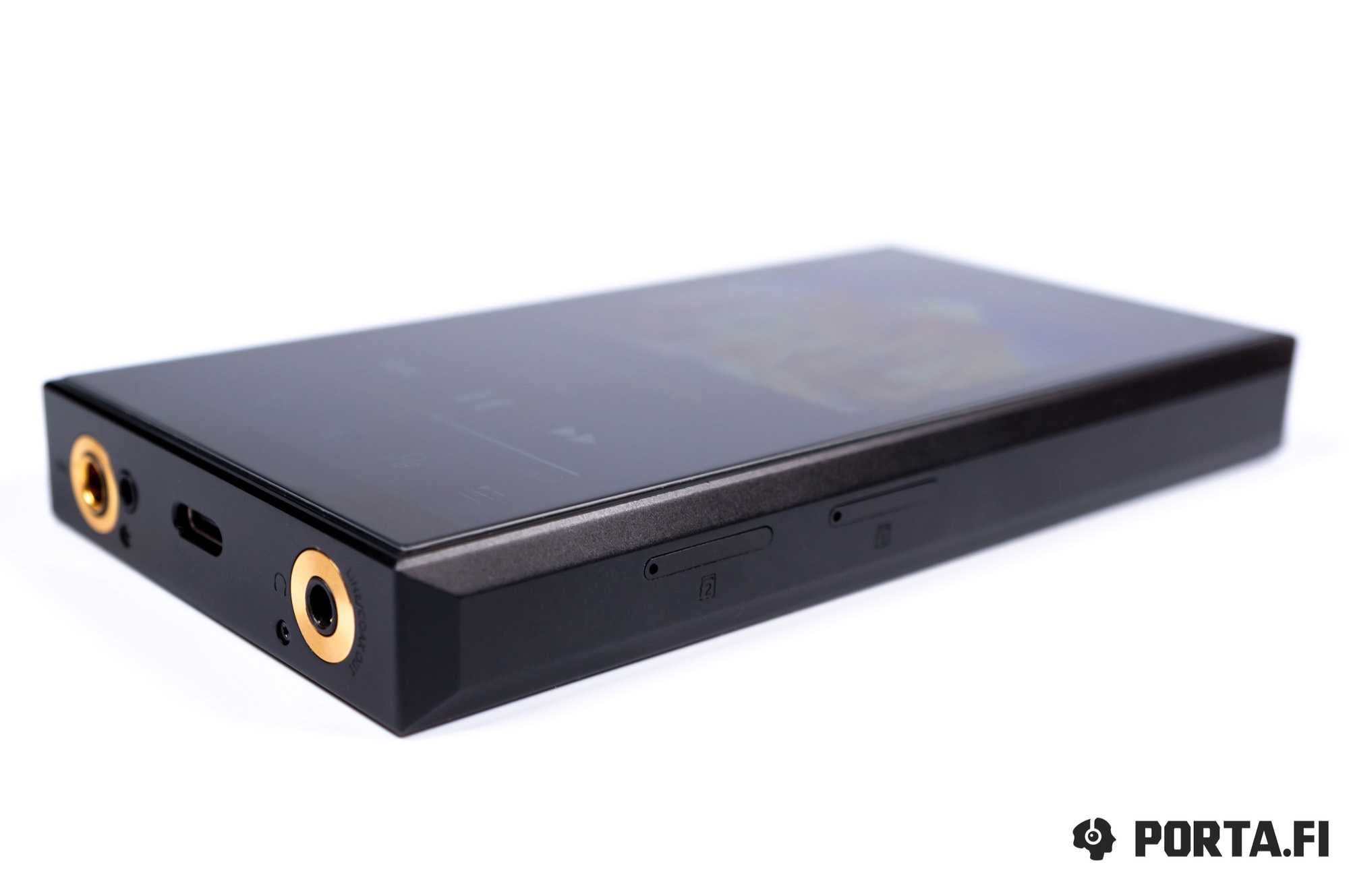 На верхней грани поместили кнопку включения/выключения, на правой — два слота для карт памяти, они как и в других моделях сделаны с “лотками” что призвано защищать внутренности плеера от пыли и фрустрировать пользователей, забывающих “скрепку” для извлечения дома. С учётом довольно быстрого падения цен на карты памяти, скоро носить с собой террабайт музыки перестанет быть проблемой для владельцев M11 любящих DSD.