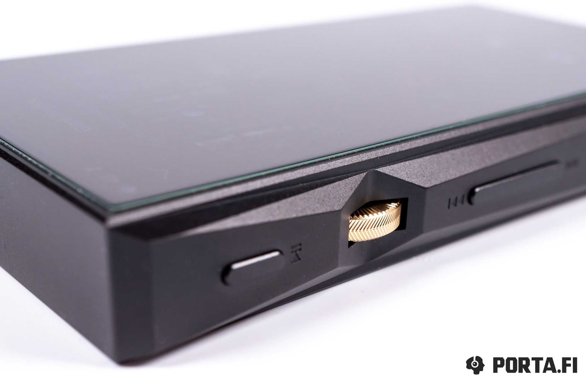 На левой стороне плеера размещён выступ с элементами управления, аналогичный X5-3 и X7-2, тут находятся колёсико громкости, качелька навигации по трекам (умеет и листать, и перематывать) и кнопка воспроизведения/паузы. Для регулятора громкости используется качественный энкодер, поэтому золотистое колёсико с угловой насечкой вращается с хорошо фиксирующимися щелчками, без проскакиваний и ложных срабатываний.