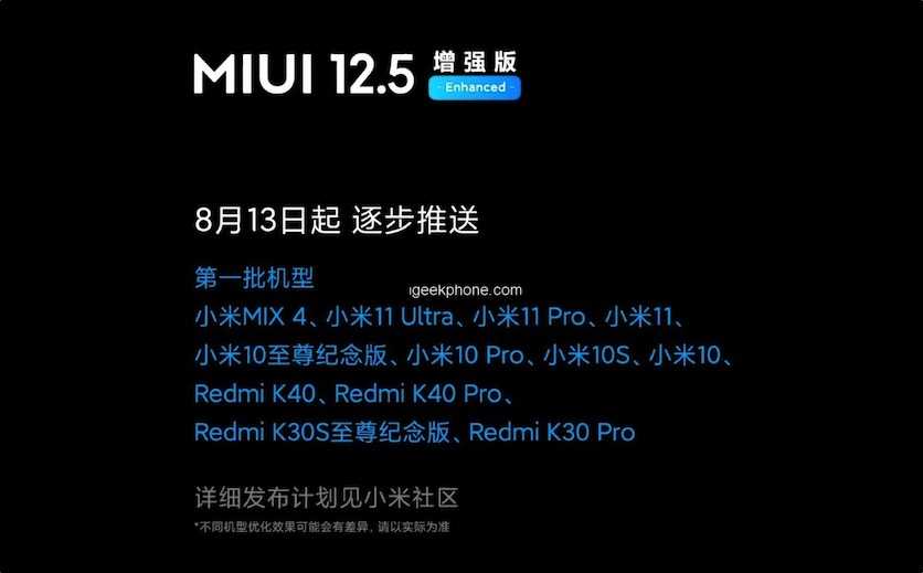 Релиз MIUI 12.5 Enhanced состоится 13 августа. В список устройств, для которых новейшая прошивка будет доступна в день выпуска, вошли смартфоны Xiaomi Mi Mix 4, Mi11, Mi11 Pro, Mi10, Mi10 Pro, Mi10S, Mi10 Extreme Commemorative Edition (ECE), Mi11 Ultra, а также Redmi K40, K40 Pro, K30S ECE и K30 Pro.