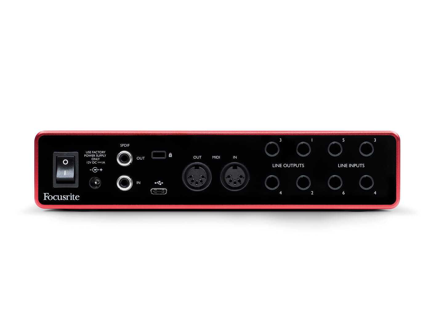 Next up is the 8i6. It features two combi instrument and mic inputs around the front with two mic preamps. There are a couple of headphone outs plus level control, again with gain halos. Around the back you get S/PDIF I/Os, MIDI Input and Output, plus a further four inputs for line-level instruments (synths, drum machines etc), so with decent MIDI- and line-input specs, Focusrite is certainly acknowledging the growing hardware-synth scene with this one.