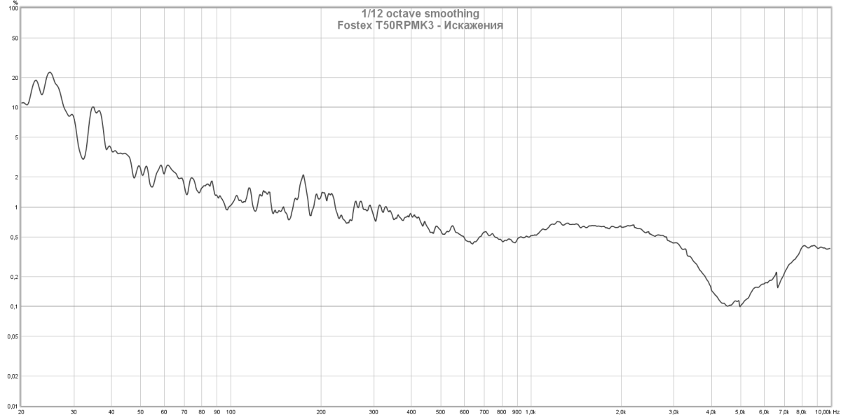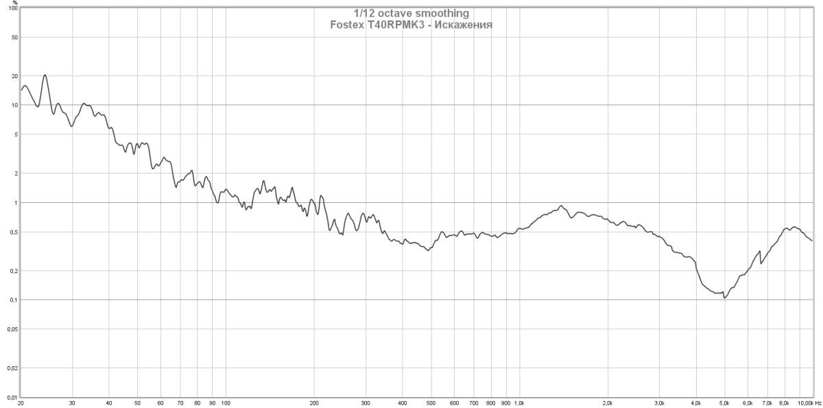 АЧХ модели T40RP имеет выраженную ступеньку в области 1 кГц, которая фактически разделяет среднюю линию на два уровня с разницей примерно 5 дБ. Характерная выгнутая форма графика в басовой области ответственна за акцент на среднем басе. Заметная разница в отдаче левого и правого канала на частотах ниже 100 Гц совпадает с ростом искажений, что позволяет предположить возможность получить лучшие показатели в этой зоне с более мощным усилителем.