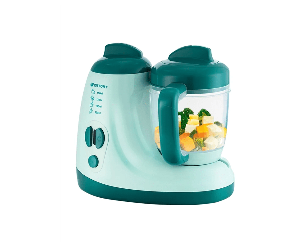 Эта недорогая и компактная модель блендера-пароварки отлично подойдет для приготовления пюреобразных блюд, которые можно давать ребенку с самого начала прикорма. Прибор готовит блюда равномерно, продукты не пригорают и не перевариваются. Для того, чтобы измельчать продукты до нужной консистенции, рекомендуется добавлять в чашу немного воды, тогда пюре получится идеальным. Помимо приготовления блюд устройство имеет функцию для подогрева бутылочек или баночек с питанием. Для этого блендер-пароварка KT-2309 оснащен специальной подставкой, которая устанавливается в контейнер для воды, а на нее помещается емкость для подогрева.