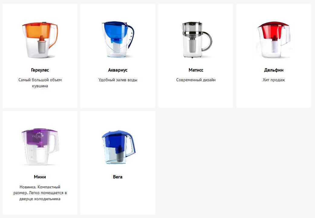 Кувшинов «Аквафор» выпускает 13 разновидностей, объемом от 2 до 3,9 литра. Пластик, из которого изготовлены приборы, также является безопасным и сертифицированным на мировом уровне.