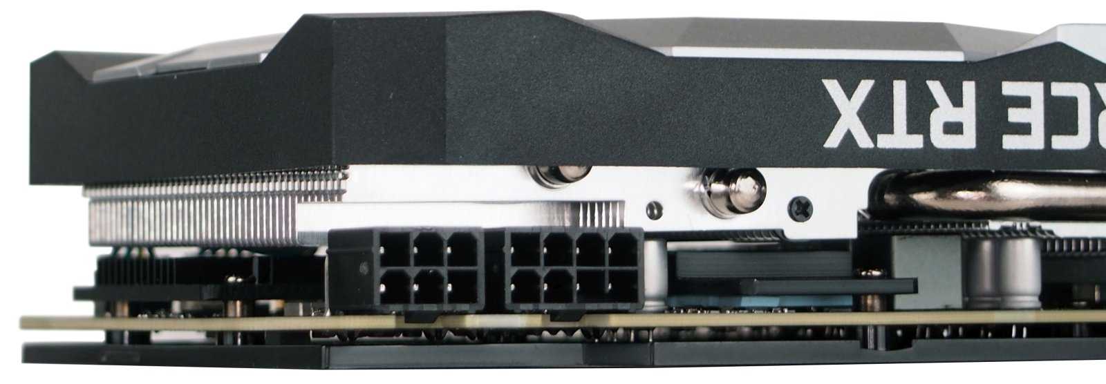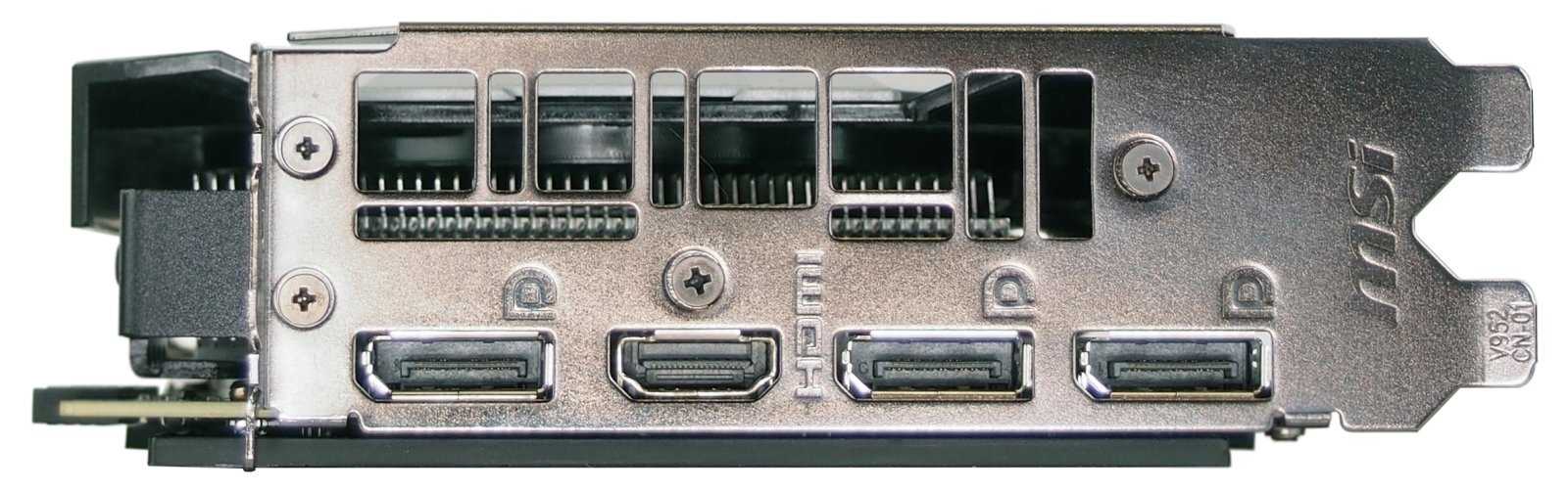 Панель разъемов RTX 2070 Super Ventus OC для вывода изображения включает в себя три DisplayPort 1.4 и один HDMI 2.0b. Также на верхнем торце видеокарты присутствует разъем NVLink для создания мульти-GPU конфигураций.