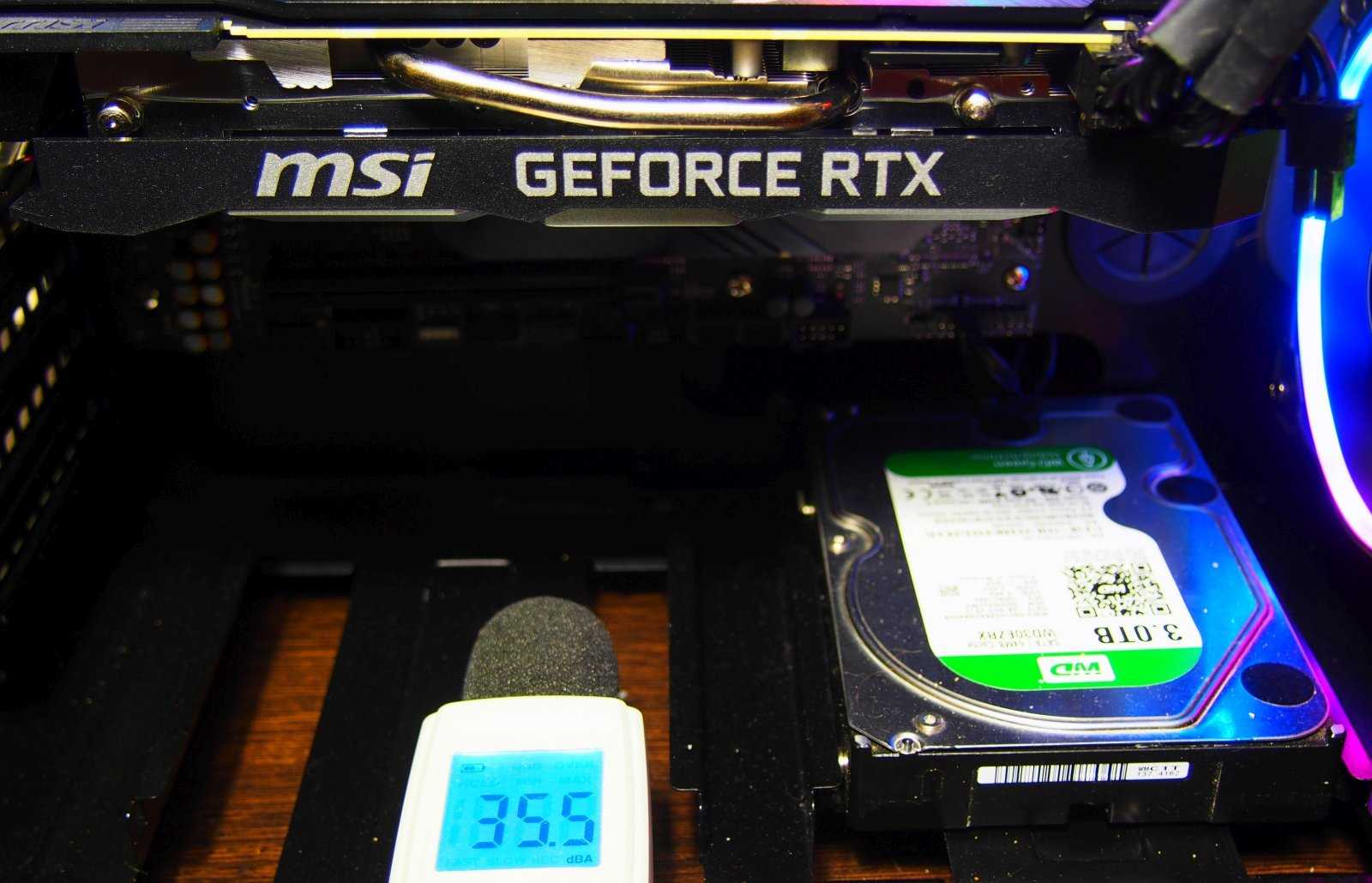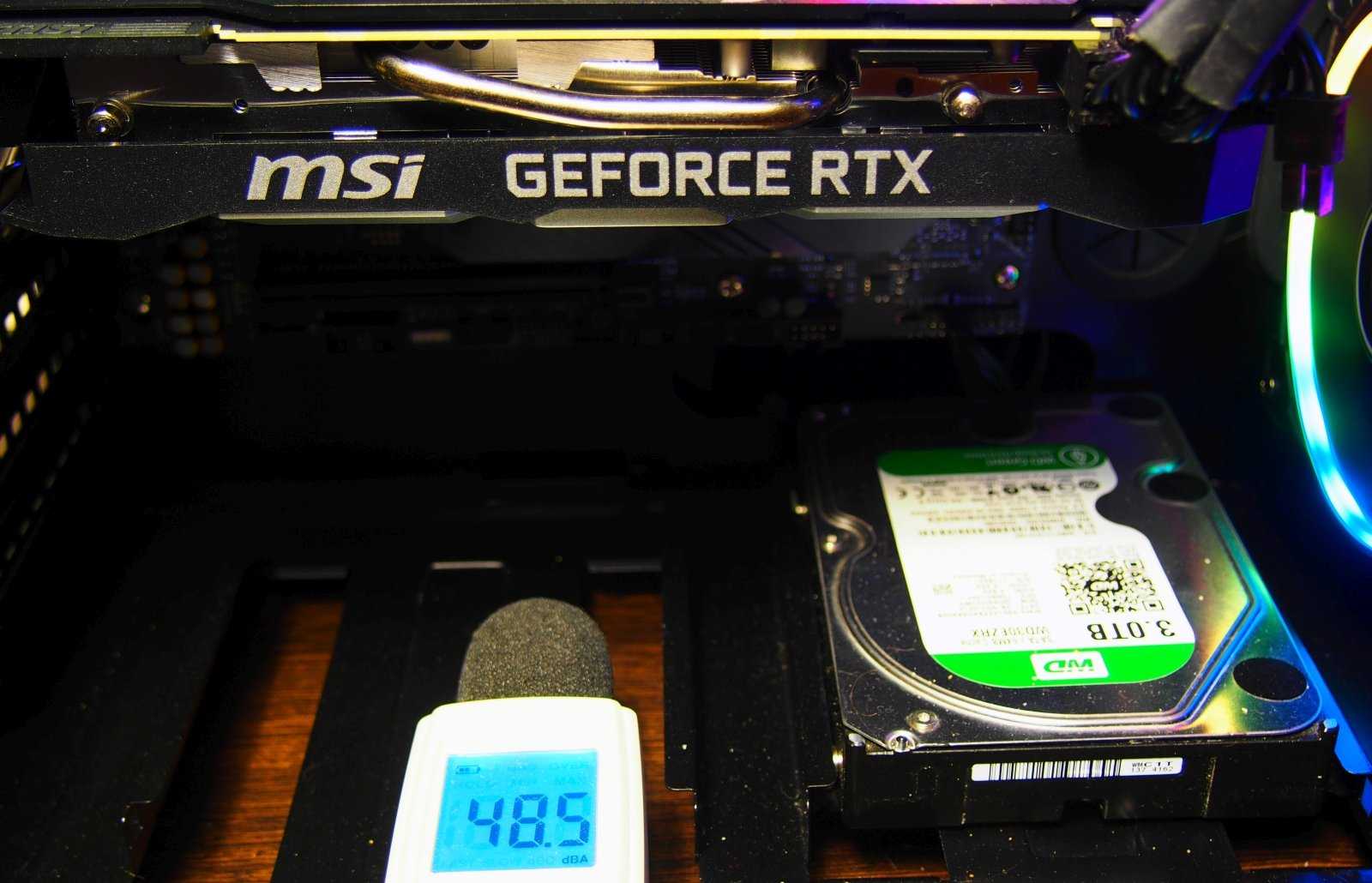 Чтобы не быть голословными в отношении высокого уровня шума видеокарты RTX 2070 Super Ventus OC, мы измерили значения без нагрузки и с полной нагрузкой графического адаптера.