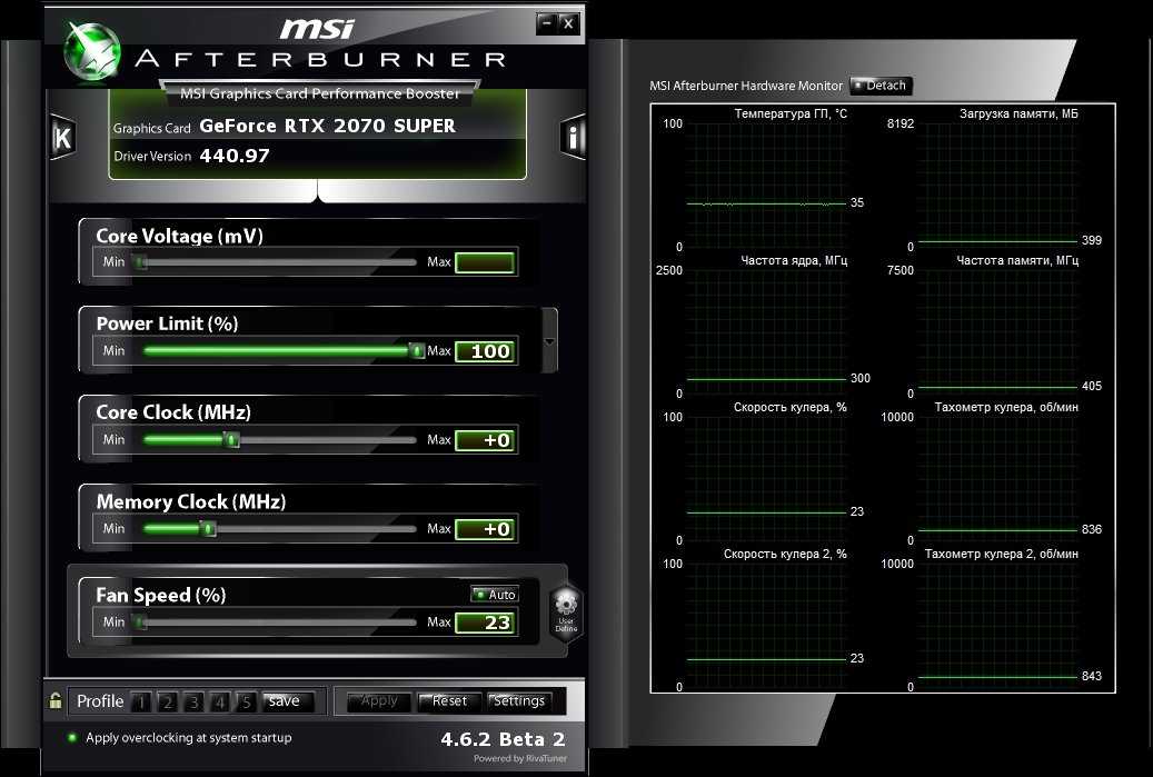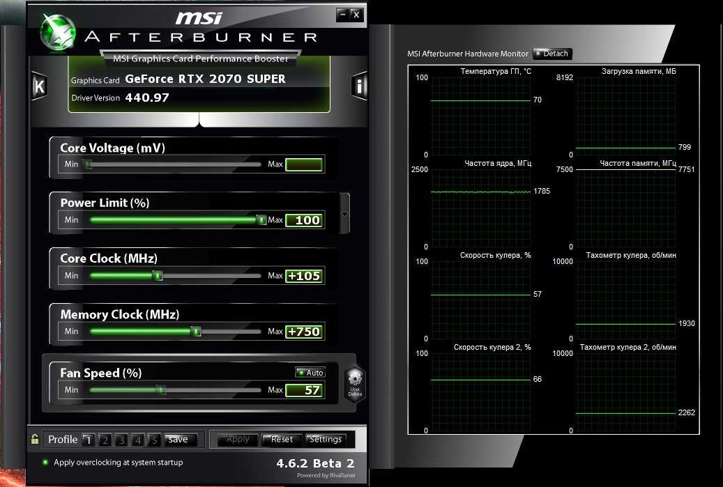 Видеокарта RTX 2070 разгон держит вполне прилично. Используя MSI Afterburner можно увеличить частоту памяти и ядра и отрегулировать лимит потребления. Рекомендуемые параметры для Эфириума:
