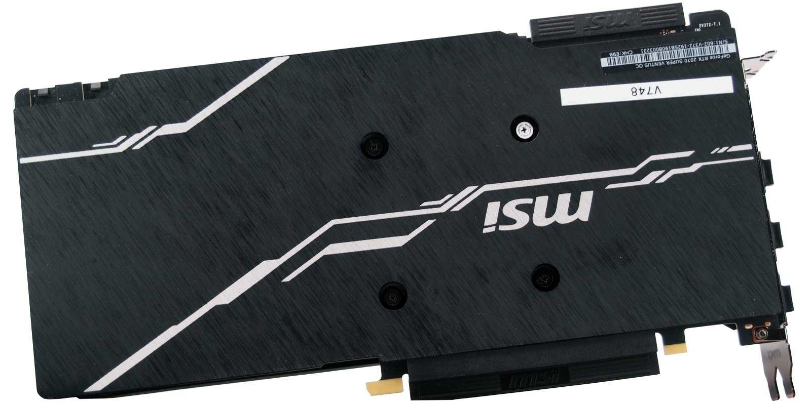 Вся тыльная сторона RTX 2070 Super Ventus OC прикрыта пластиковым бэкплейтом для защиты печатной платы видеокарты от механических повреждений. Но и даже с эстетической точки зрения наличие этого элемента делает продукт внешне более солидным и интересным.