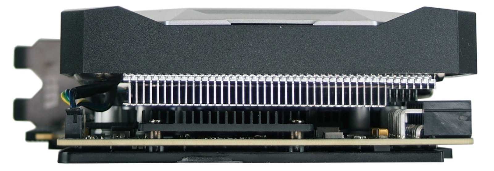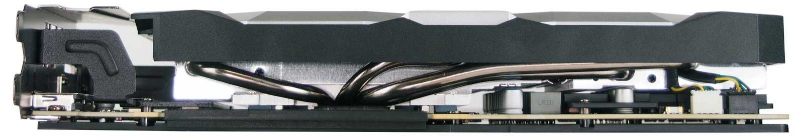 Как мы уже упоминали, на задней панели есть несколько вырезов, которые позволяют воздуху проходить через карту более свободно, что в итоге обеспечивает лучший отвод тепла и эффективность. Большая медная пластина и несколько медных тепловых трубок проходят сквозь алюминиевые рёбра радиатора. Медная пластина напрямую контактирует с графическим процессором и видеопамятью, очень эффективно перенаправляя тепло через медные трубки.