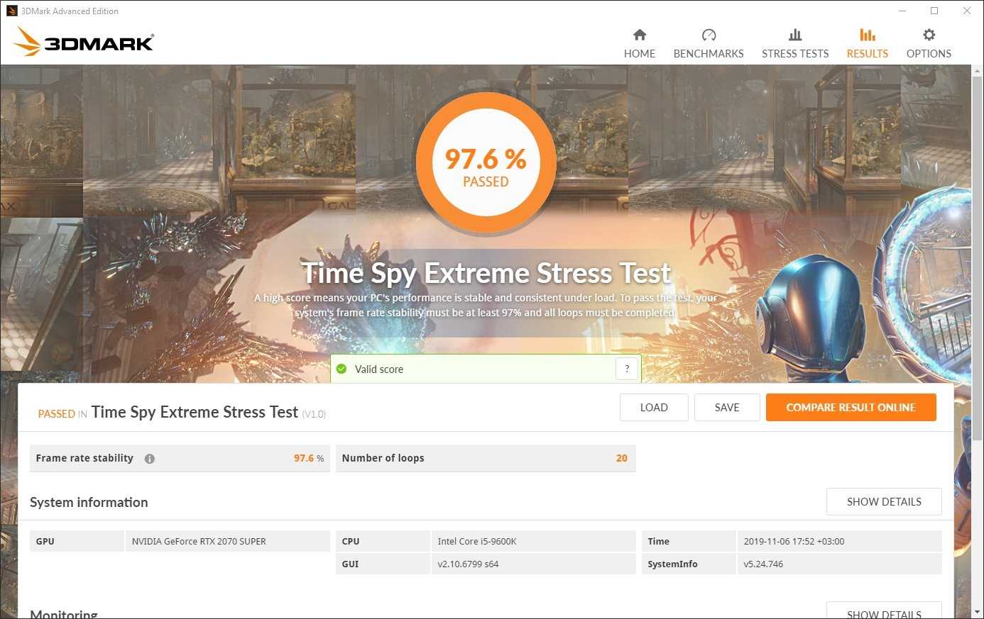 Стабильность разгона видеокарты RTX 2070 Super Ventus OC подтвердили 20 прогонов бенчмарка 3D Mark Time Spy Extreme Stress Test.