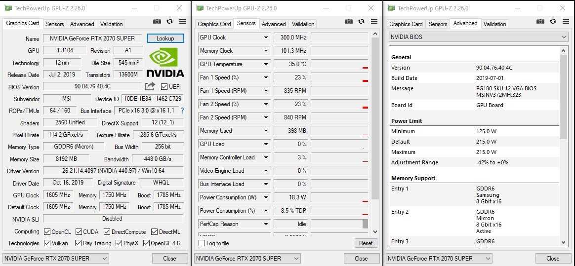 Оценку видеокарты RTX 2070 Super Ventus OC начинаем по традиции с изучения технических характеристик, предоставляемых программой GPU-Z. Видно, что лимит энергопотребления графического адаптера производитель жестко ограничил на значении в 215 Вт. Учитывая не самую продвинутую систему охлаждения видеокарты, это вполне оправданно.