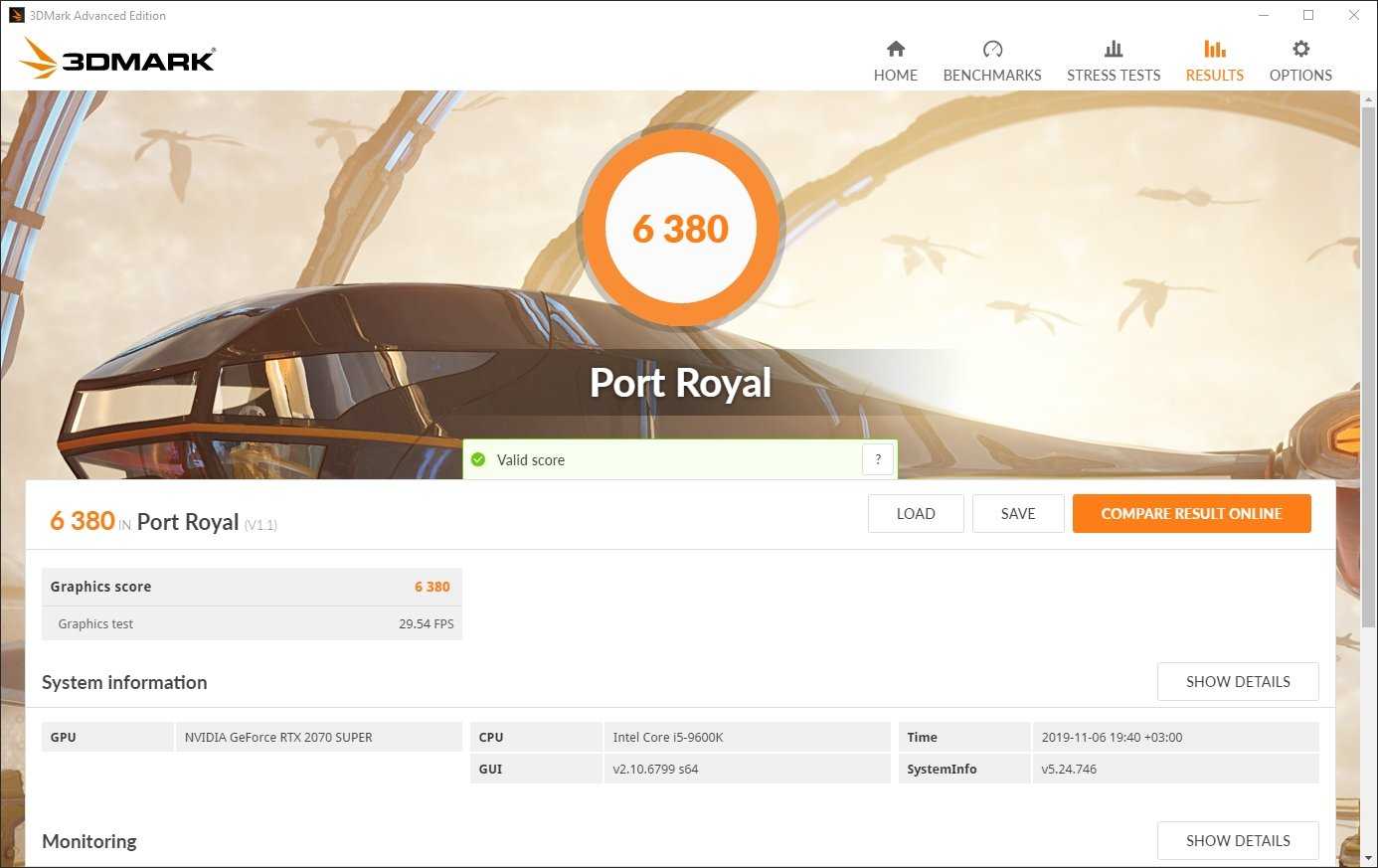 Что не отнять у видеокарты RTX 2070 Super Ventus OC, даже с учетом простой системы охлаждения, так это высокой игровой производительности. Результаты в нескольких графических пакетах 3D Mark и Benchmark Superposition наглядно демонстрируют уровень видеокарты. Особенно впечатляющие результаты показала RTX 2070 Super Ventus OC при задействовании технологии Ray-tracing в бенчмарке Port Royal. На скриншотах ниже представлены результаты производительности видеокарты: до разгона — слева, после разгона — справа.