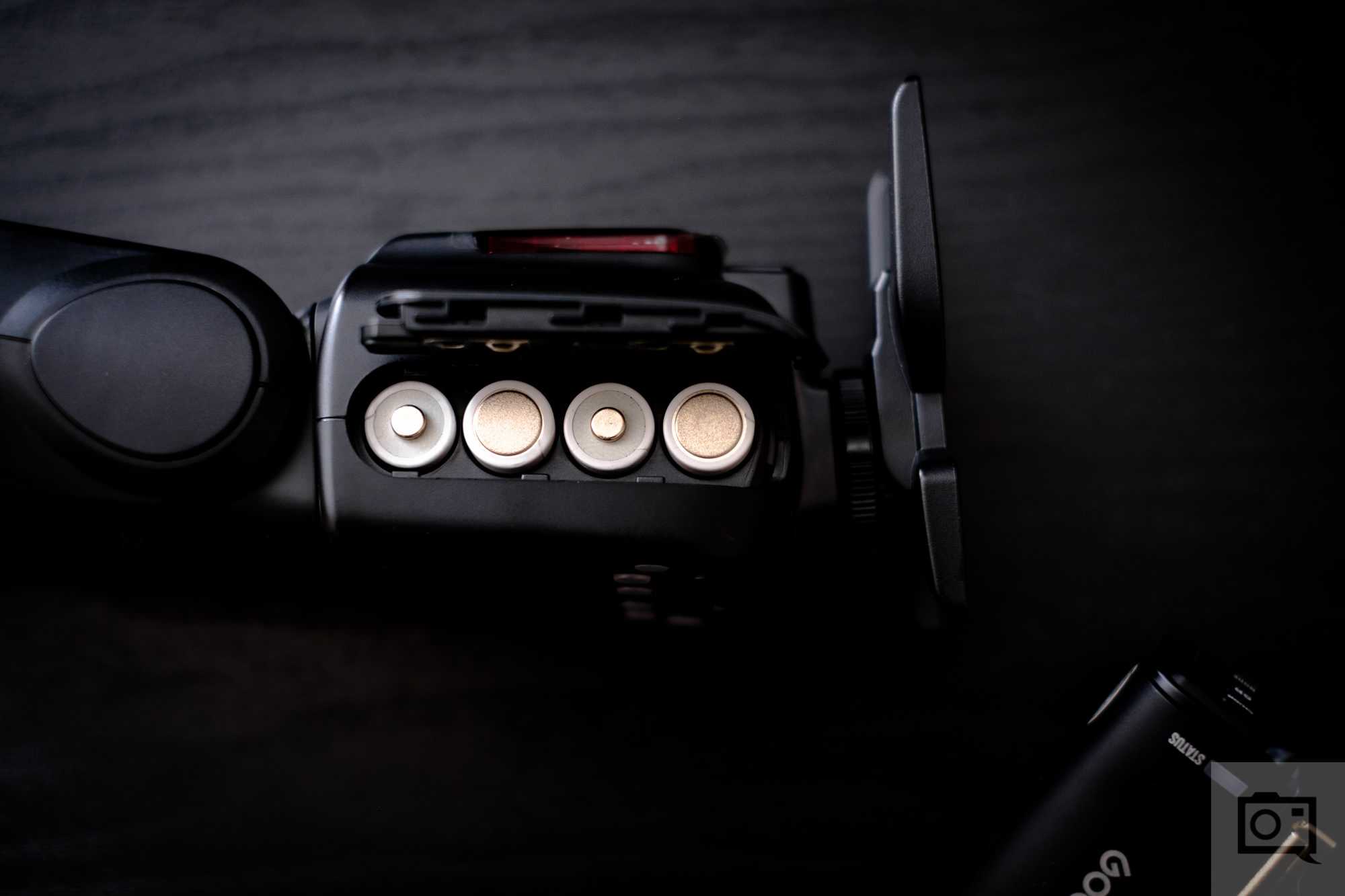 С другой стороны расположен батарейный отсек. Он растянулся вертикально по всей высоте корпуса вспышки, что непривычно и даже необычно.