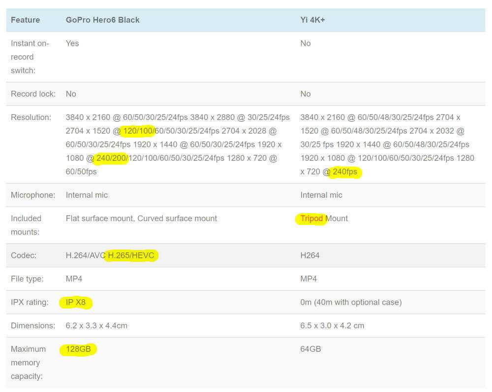 Если сравнивать характеристики и форматы записи видео, то в GoPro Hero 6 видно только одно преимущество — возможность записывать Slow Motion видео 1920 x 1080 со скоростью 240 кадров в секунду. В YI 4K Plus, в таком разрешении, максимум можно «выжать» 150 FPS и то с использованием этого мода прошивки.