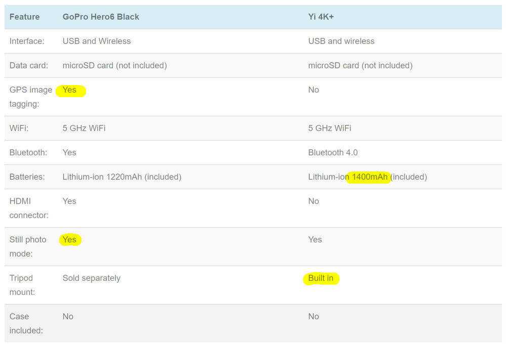 На этом явные преимущества успешно заканчиваются. Так, для энтузиастов, в камере YI 4K Plus гораздо больше форматов записи видео, есть даже запись со всего сенсора, в разрешении 4000 x 3000 и частотой 30 кадров в секунду. Впрочем, сравнение характеристик приводится в таблице ниже, преимущества выделены желтым маркером.