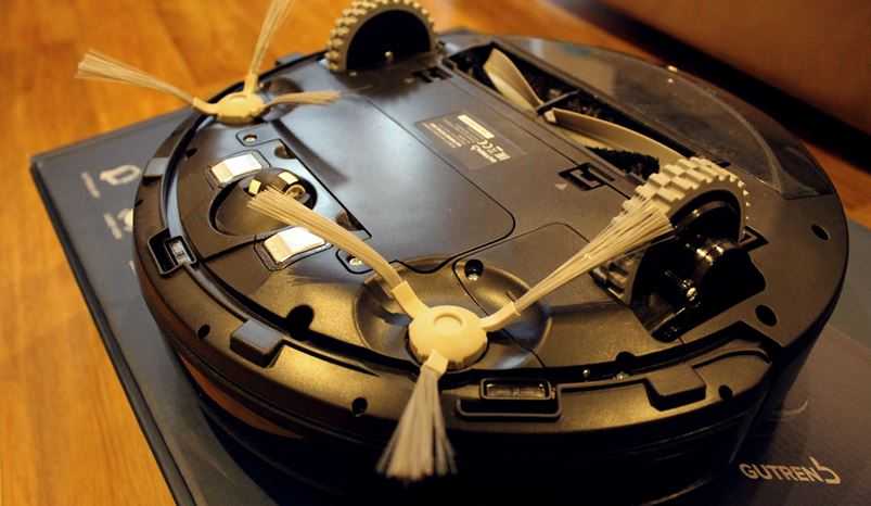 В числе датчиков навигационной системы те, которые расположены снизу – датчики высоты. Они не дадут роботу упасть с лестницы или другой высоты. Рядом с этими датчиками находятся боковые щетки, сзади – центральная. Движение происходит за счет направляющего и ведущих колес, имеющих амортизаторы.