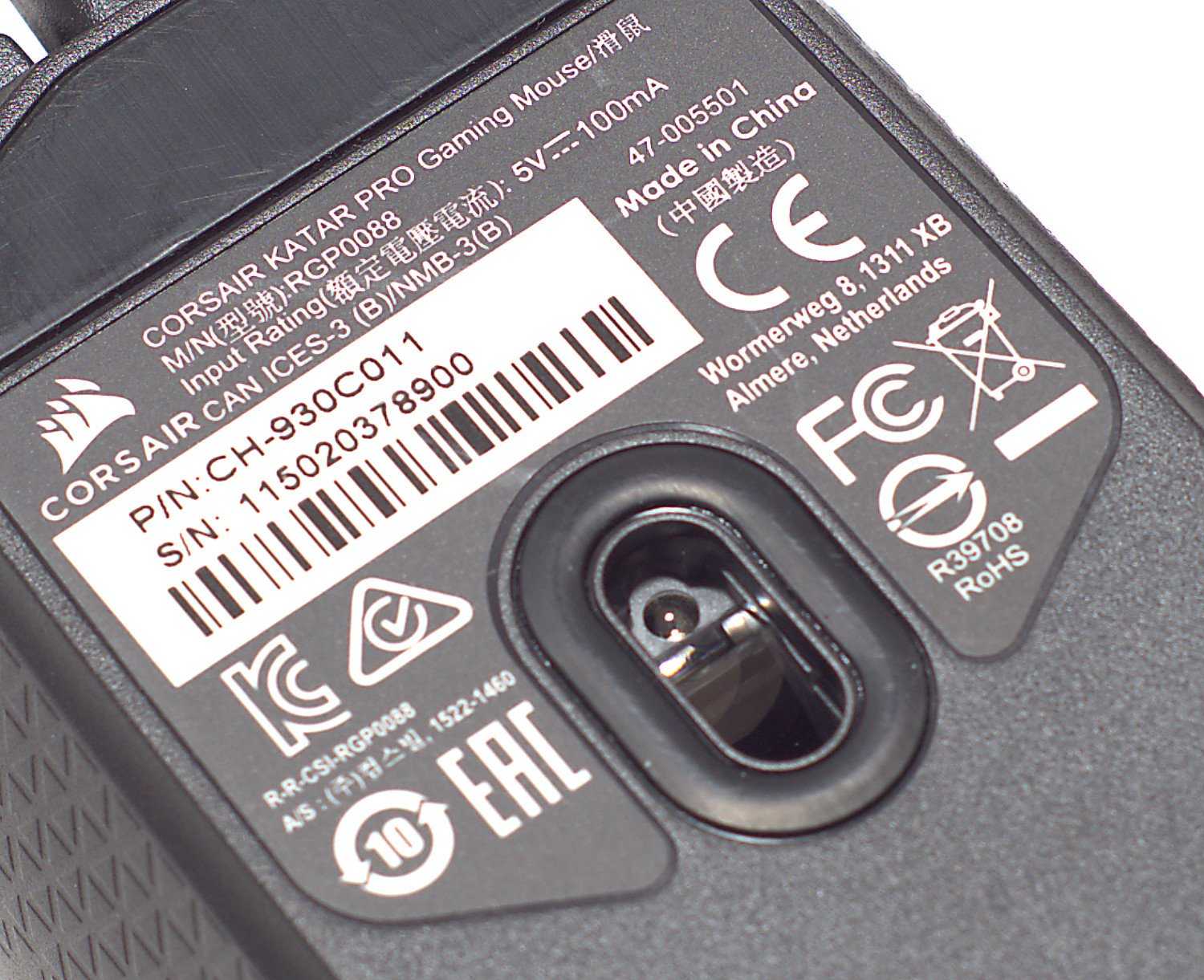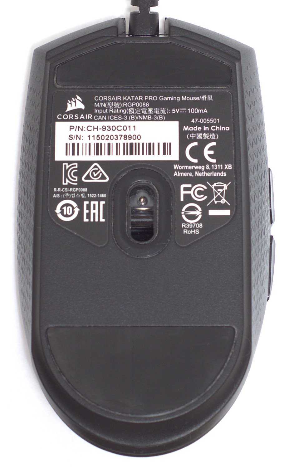 Наклейка снизу содержит техническую информацию: название мыши, серийный номер и рабочее напряжение/ток (5 В, 100 мА). С точки зрения оптического сенсора PixArt 3327 заявлено максимальное разрешение 12400 DPI. Этого будет более чем достаточно, чтобы построить разрешение мыши «под себя».