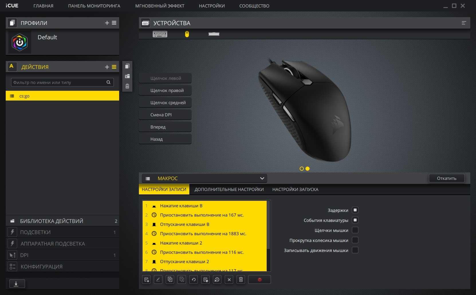 К сожалению, встроенных профилей мышь не имеет, поэтому все будет «работать» только при использовании утилиты iCUE.