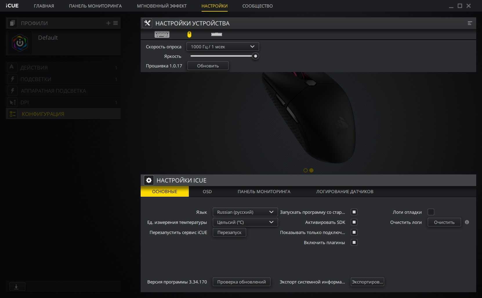 В разделе «Настройки» можно задать частоту опроса мыши (до 1000 Гц), яркость подсветки, обновить прошивку, также имеются другие настройки, связанные с программой iCUE.