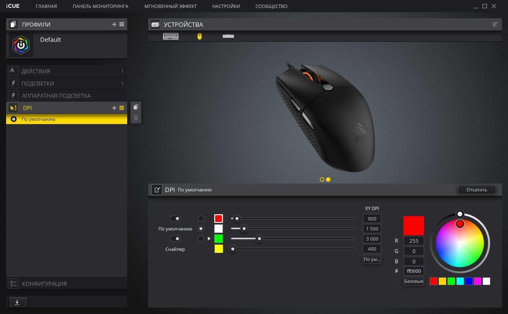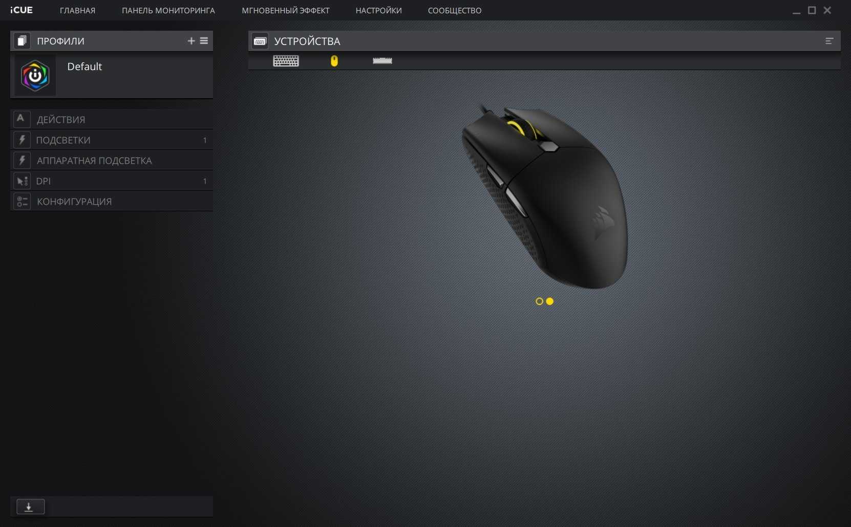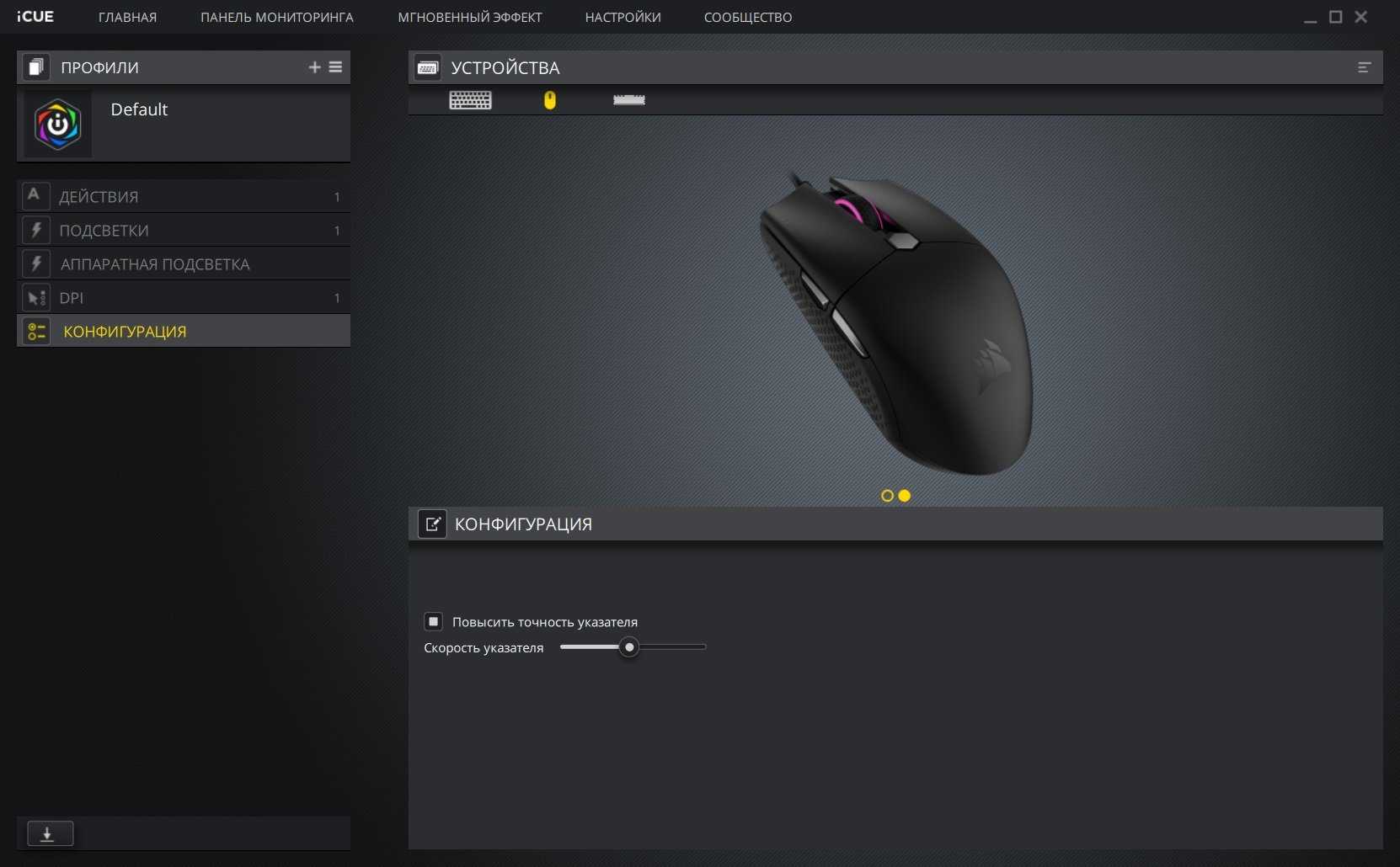 Для настройки игровой оптической мыши Corsair KATAR PRO используется универсальное фирменное программное обеспечение Corsair iCUE. Интерфейс русскоязычный и разобраться в нем несложно.