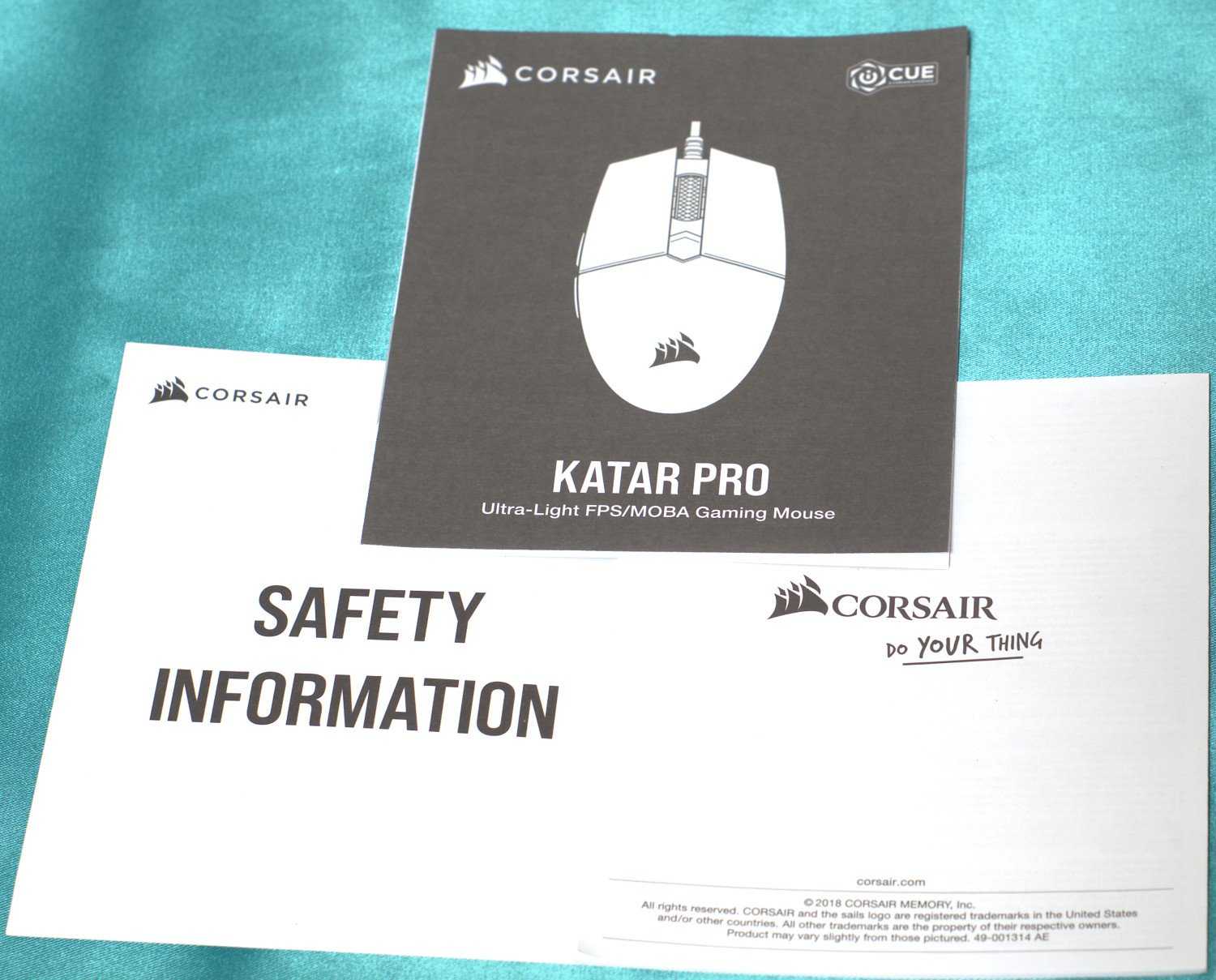 В модельном ряду компании Corsair мышь можно отнести к бюджетному уровню, поэтому комплектация соответствующая: руководство пользователя, информация о технике безопасности и гарантии.