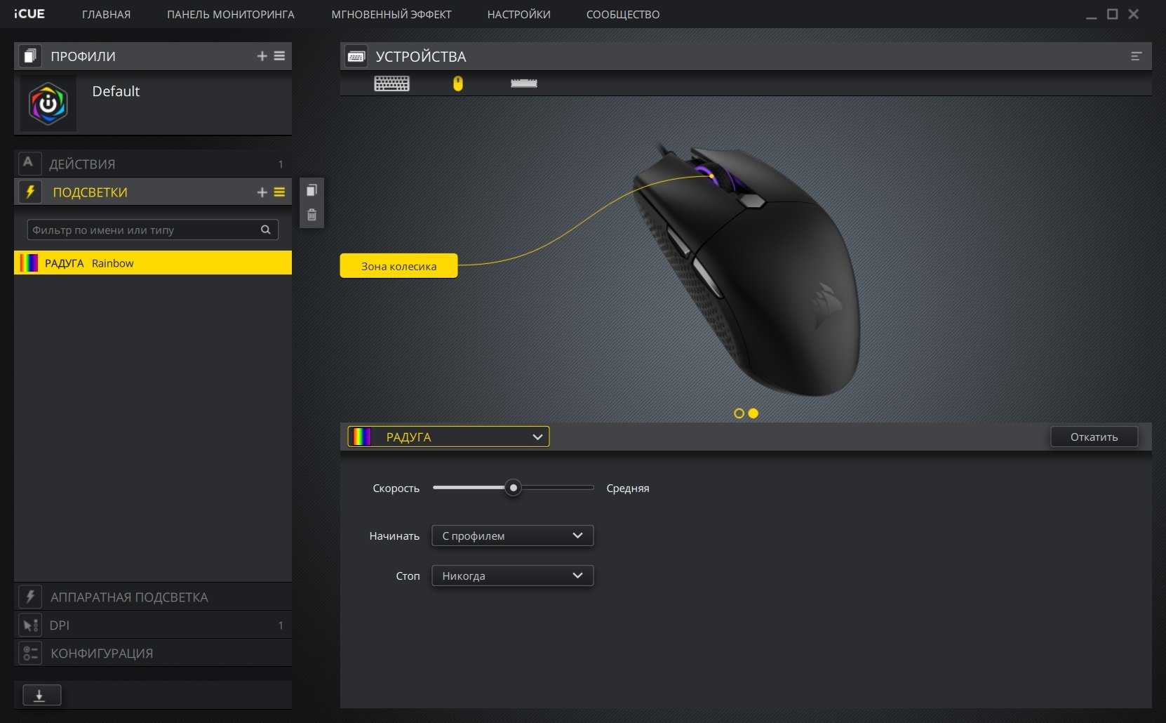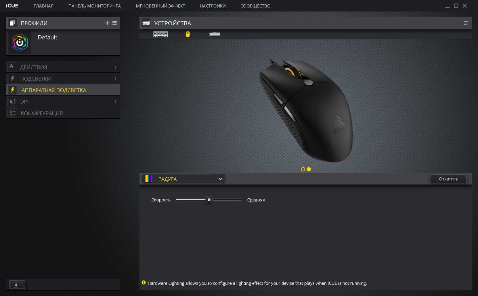 3. «Аппаратная подсветка». Эффект подсветки, который работает, если утилита iCUE не загружена. В отличии от предыдущего подраздела здесь можно задать только скорость работы подсветки.