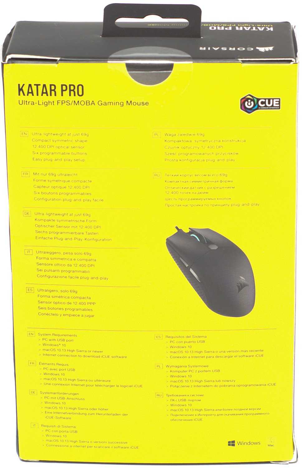 Упаковка игровой оптической мыши Corsair KATAR PRO выполнена в фирменных тонах компании. На ней размещено изображение внешнего вида мыши и присутствует многоязычное описание. Просто и стильно.