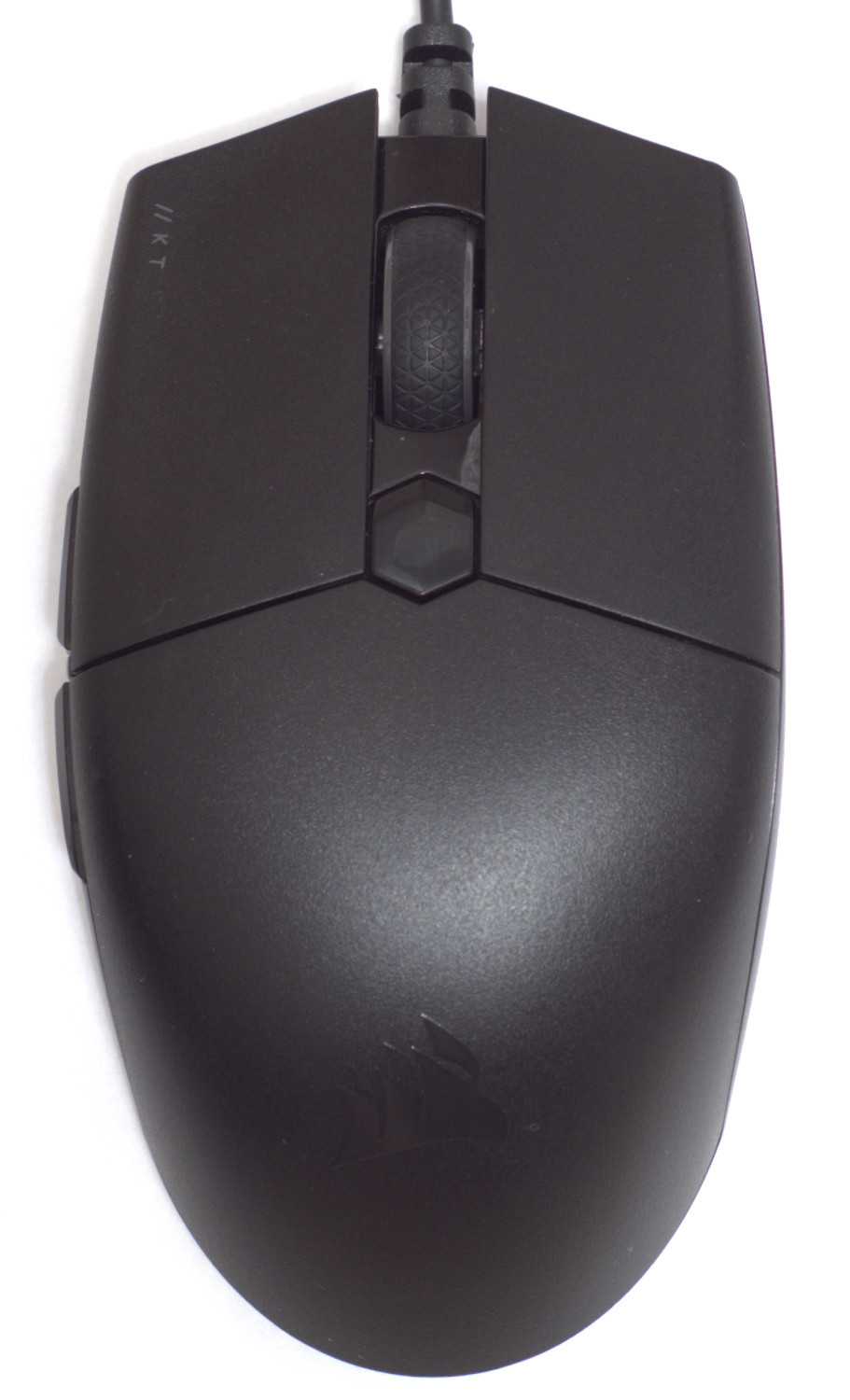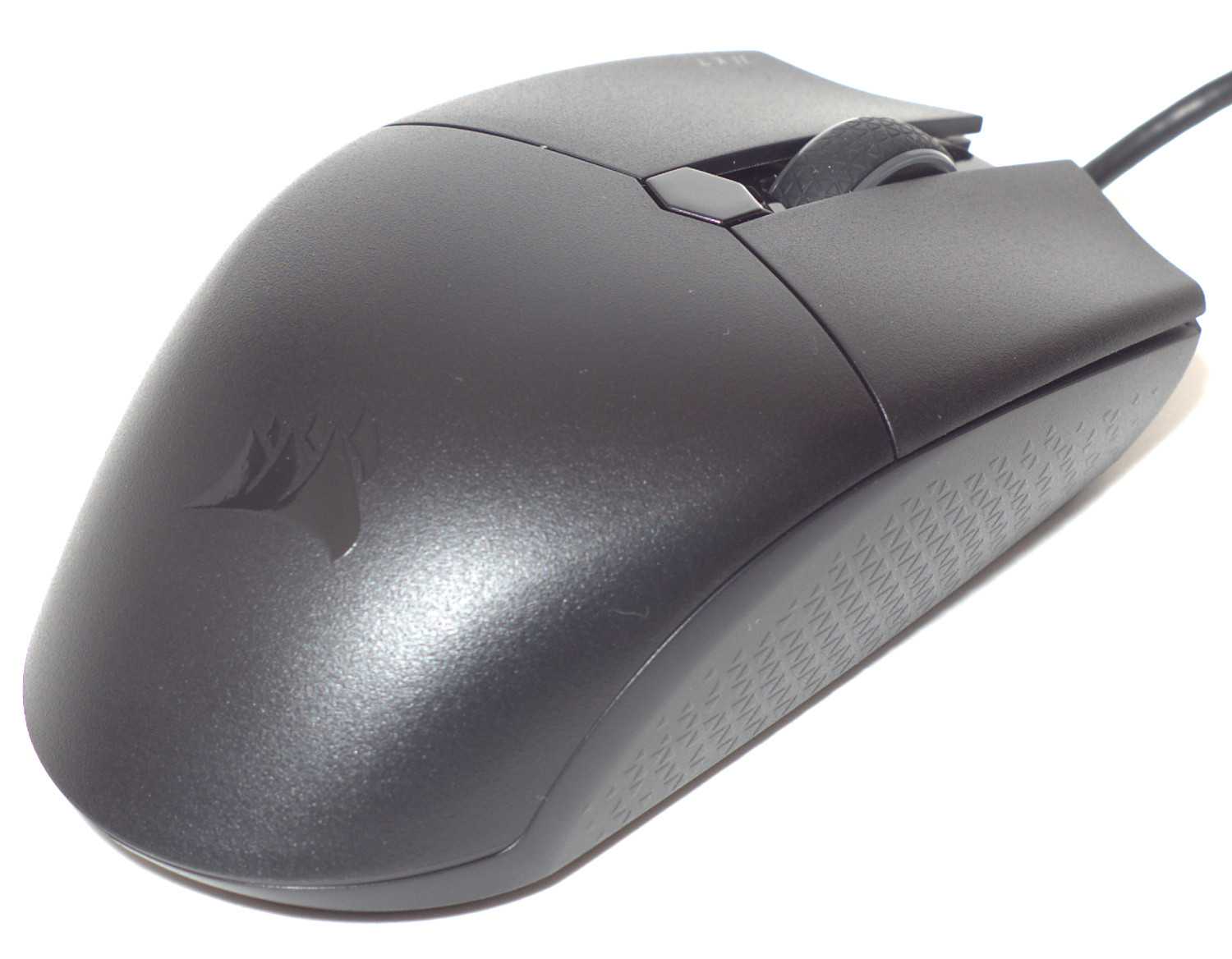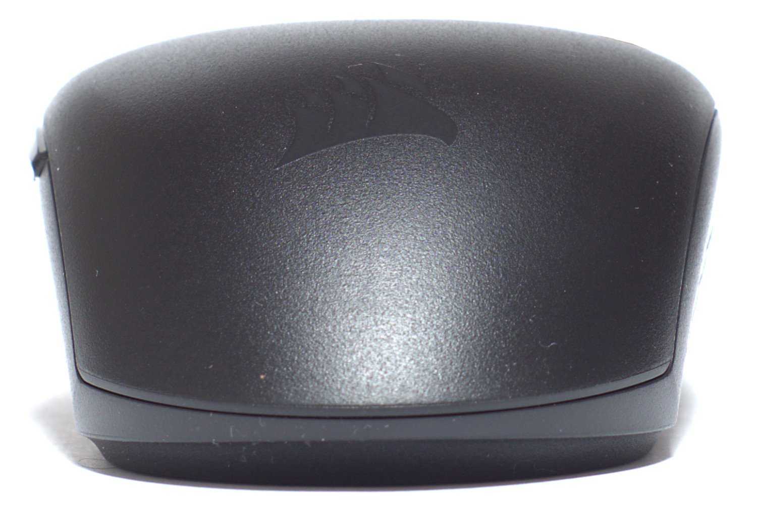 Высота корпуса небольшая (37.8 мм), в итоге с узкой стороны мышь получилась «приплюснутой». С точки зрения удобства использования колесико прорезинено и имеет текстуру для тактильных ощущений. На колесике с боков заметны полупрозрачные ободки, через которые будет видна работа RGB-подсветки. На задней части присутствует логотип Corsair, правда его подсветка не предусмотрена.
