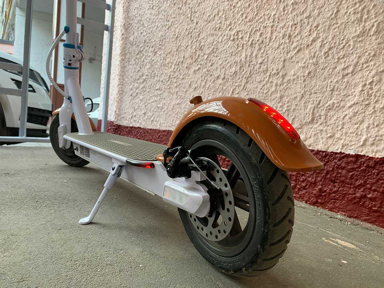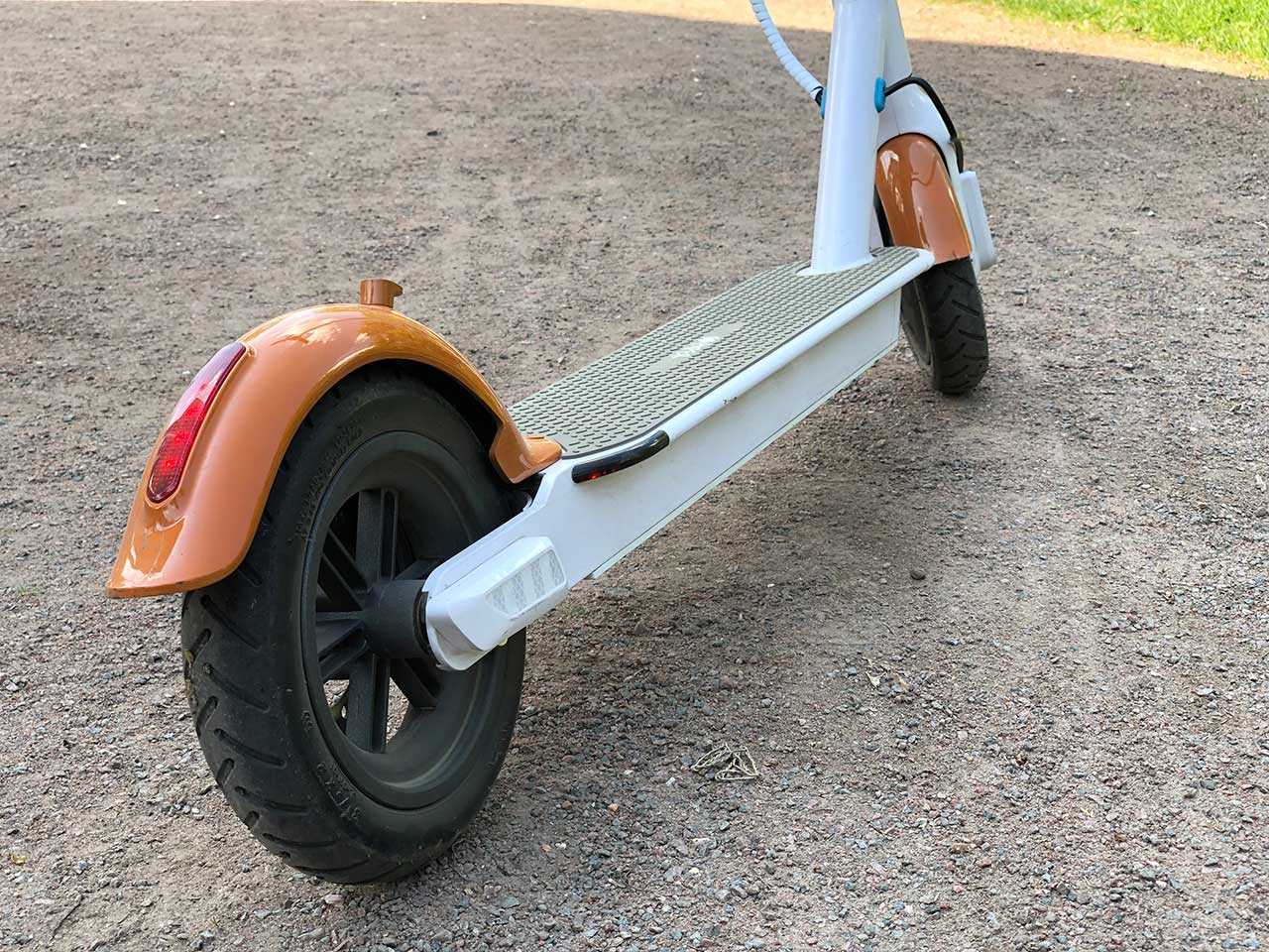 Шины — 8,5 дюймов, мягкие литые. Корпус защищён от влаги по стандарту IPX4, есть антикоррозионное покрытие. Разъём для зарядки расположен на днище корпуса, закрывается резиновой заглушкой. Ездить в дождь на электросамокатах не рекомендуется, но я ездил в сырую погоду, и никаких последствий для корпуса (разве что, грязь).