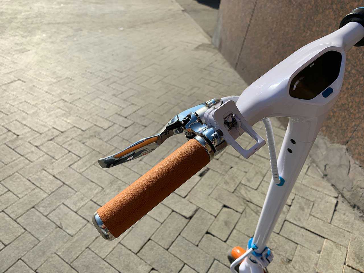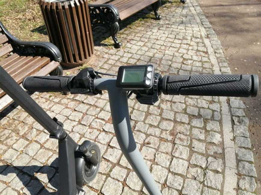 На руле можно найти рычаг акселератора, дисплей с одинарной кнопкой под ним, звонок и рычаг тормоза. Звонок пронзительный — пешеходы сразу шугаются. Не злоупотребляйте им.