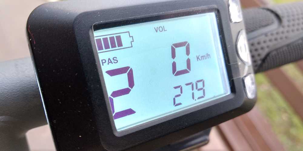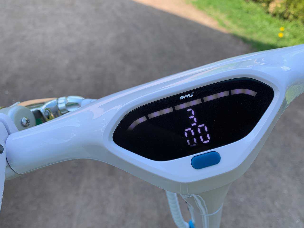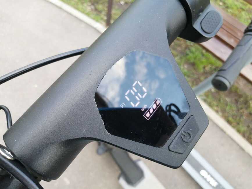 Как и положено электротранспорту, на рулевой колонке есть ЖК-экран, на котором отображается заряд аккумулятора, спидометр, выбранный режим скорости, иконки Bluetooth и включённой фары.