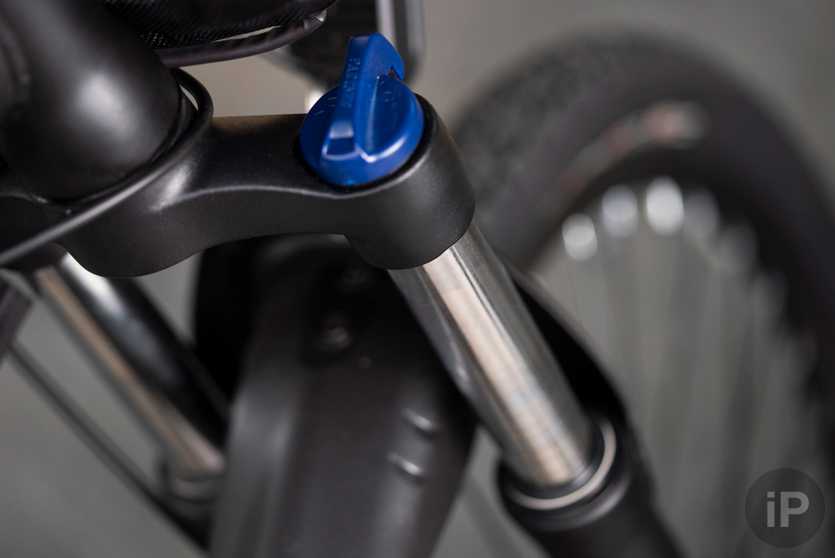 При желании самокат можно сложить: достаточно потянуть за специальный предохранитель в основании рулевой колонки и оттянуть рычаг.