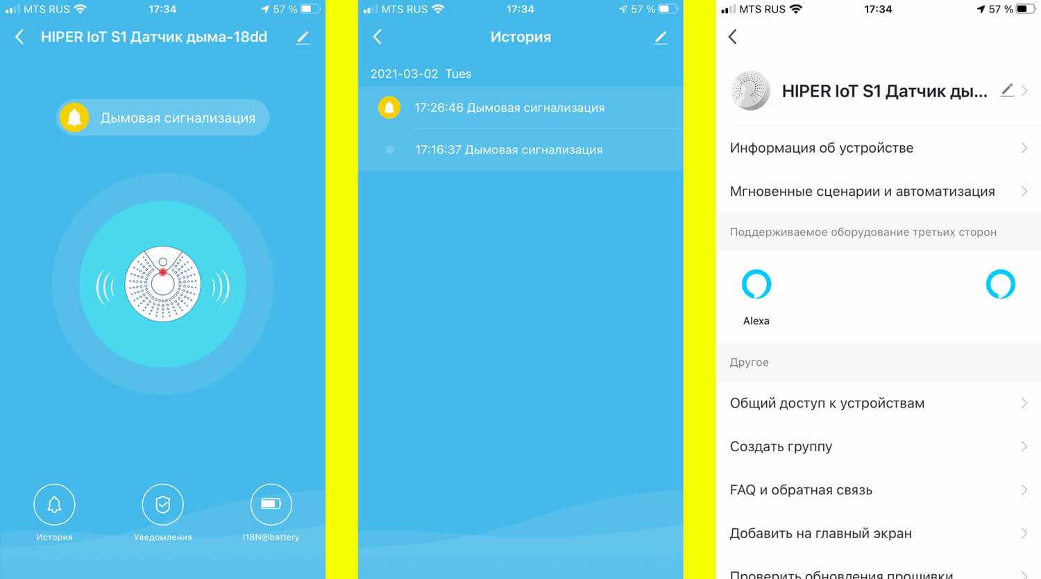 Звуковой сигнал сработавшего устройства дублируется уведомлением в приложении. Кстати, в комплекс умного дома можно и не включать, а использовать как автономный сенсор со звуковым оповещением. Звук в пределах 105 дБ достаточно громкий, чтобы разбудить спящего.