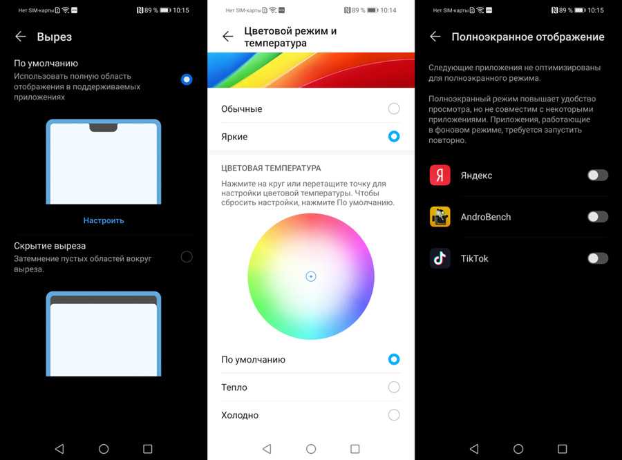 В разделе «Другие настройки экрана» предлагается опция «Вырез», чтобы затемнить пустые области вокруг физического выреза в верхней части дисплея. Там же, на вкладке «Полноэкранное отображение» указаны приложения, не оптимизированные для подобного режима. Цветовая температура выбирается на вкладке «Цветовой режим и температура» с помощью цветового круга и трех пресетов («По умолчанию», «Тепло» и «Холодно»). В свою очередь, для цветовой гаммы предусмотрено две опции –»Яркие» и «Обычные».