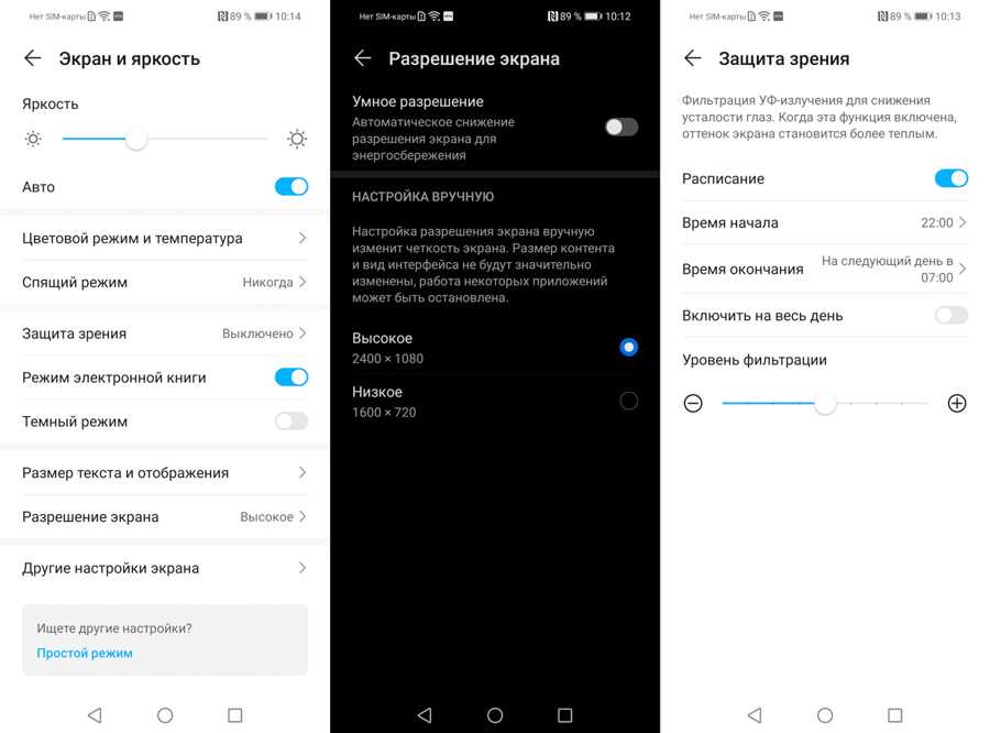 Режим электронной книги — когда цветовую гамму стараются приблизить к параметрам настоящей бумаги — переводит картинку в градации серого, имитируя на экране «электронные чернила» (эффект на скриншоте не передается). Опция «темного» режима активируется на шторке быстрых переключателей, а также в настройках «Экран и яркость». Уровень яркости предлагается регулировать вручную или воспользоваться опцией «Авто». Высокое разрешение (2400×1080 точек) можно вручную изменить на низкое (1600×720 точек), а вот выбор опции «Умное разрешение» призван улучшить энергосбережение. Режим защиты зрения, активируемый в том числе и по расписанию, призван снять усталость глаз, снижая количество синего цвета, что подтверждается сертификацией TÜV Rheinland. Уровень фильтрации при этом регулируется вручную.