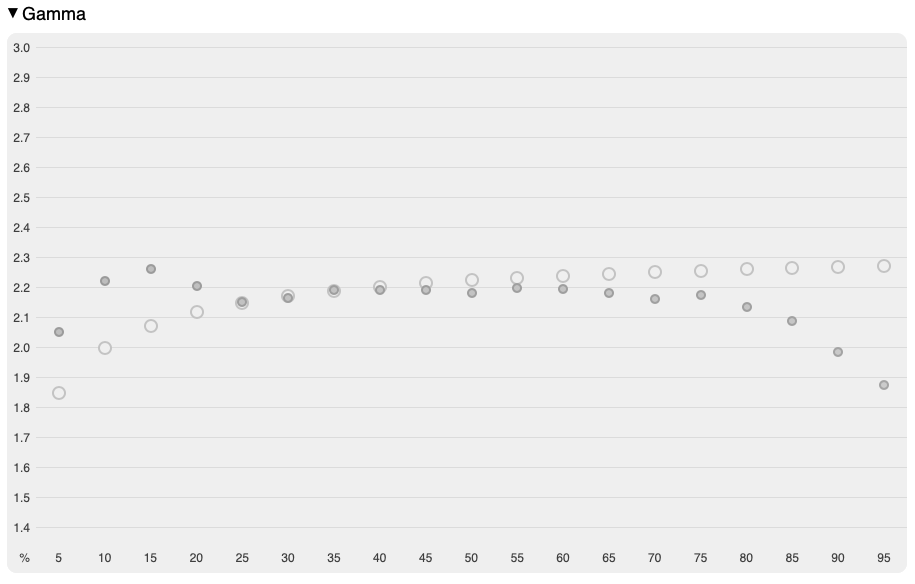 Гамма-кривая далека от степенной функции с показателем 2,2 и принимает такую форму, что снижается контраст светлых участков изображения.