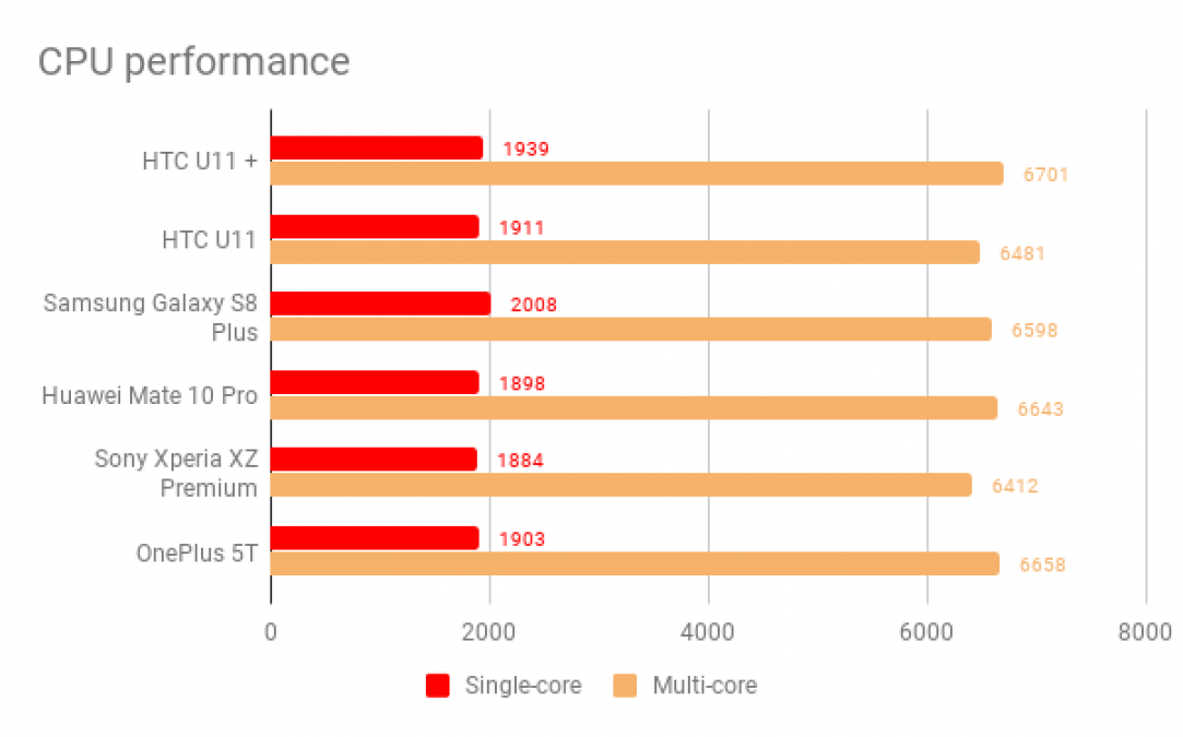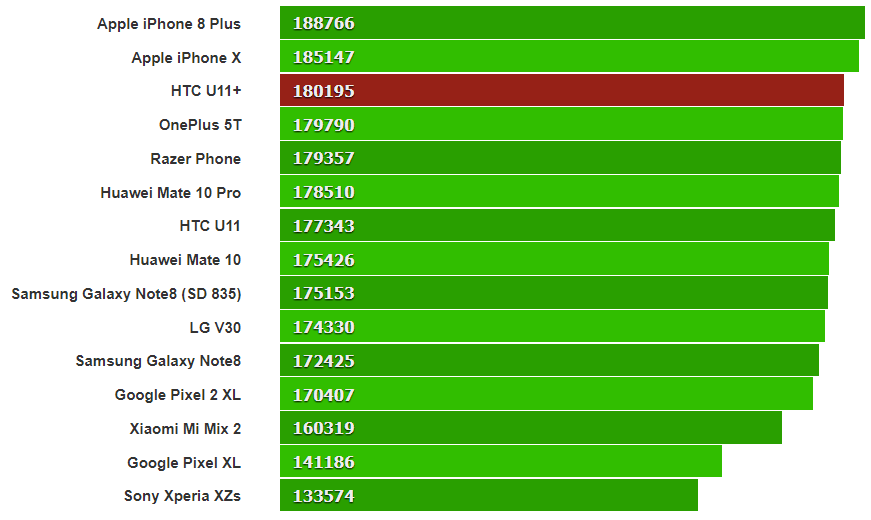 Во всех синтетических тестах гаджет демонстрирует результаты аналогичные остальным Android смартфона на 835 драконе. В AnTuTu Benchmark U11+ и вовсе набрал 180195 баллов, что на 300 попугаев больше, чем у One Plus 5T, и закрепился на первой строчке среди аналогов.