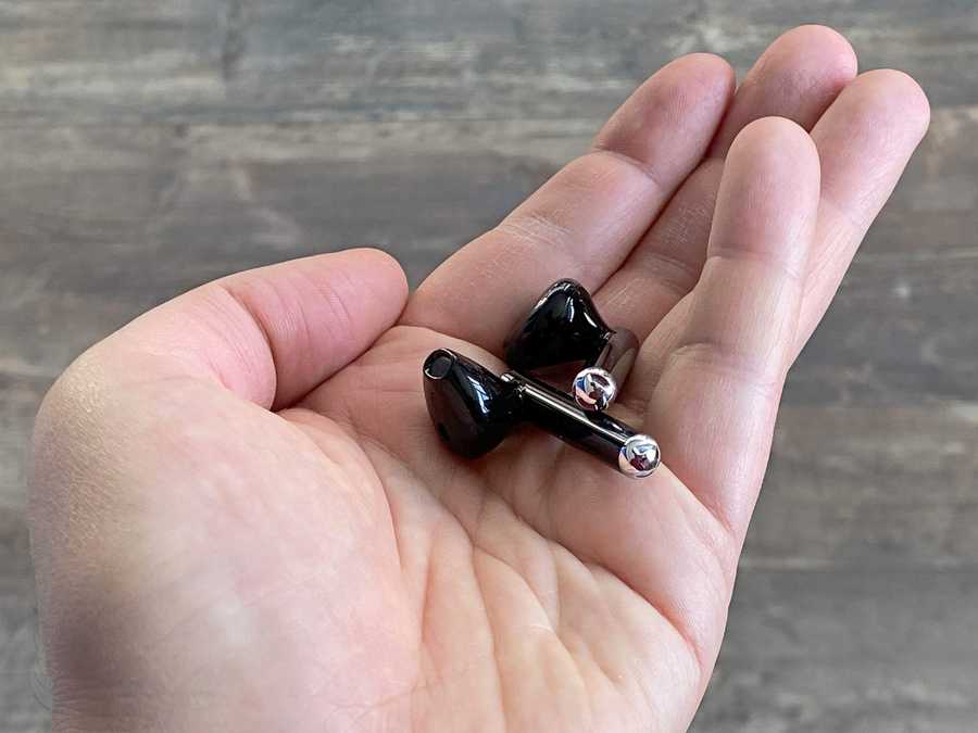 Теперь про наушники. На внешней прямоугольной ножке каждого вкладыша имеются по два микрофона с антиветровым дизайном — отверстий для них просто нет. Я не знаю, как это возможно, даже и не спрашивайте. Видно только две точки чуть темнее, чем общий материал корпуса и по 2 микроскопические прорези с каждой стороны. На передней плоской части ножки — сенсорная зона для управления функциями наушников.