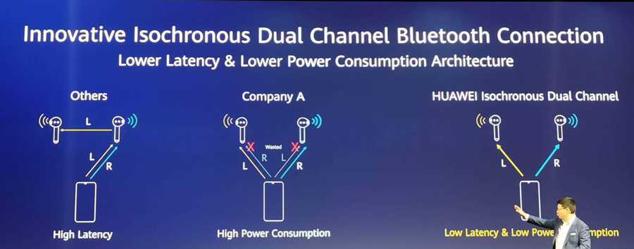 Изохронная двухканальная технология BT-UHD (Bluetooth Ultra High Definition Audio), запатентованная Huawei, одновременно передает сигналы на оба наушника, снижая таким образом не только время задержки, но и энергопотребление. Причем если типовая скорость этого протокола составляет 2,3 Мбит/с, то благодаря использованию Kirin A1 она увеличивается почти в 3 раза, до 6,5 Мбит/с. Но это касается только смартфонов с установленной оболочкой EMUI 10 (на базе Android 10). Для сравнения напомним, что технология LDAC обеспечивает передачу 990 Кбит/с, а aptX HD – 576 Кбит/с. Время задержки для FreeBuds 3 достигает порядка 190 мс, тогда как у AirPods 2 это 220 мс. Опять же для сравнения, теоретически, задержка для aptX Low Latency (LL) не должна превышать 40 мс.