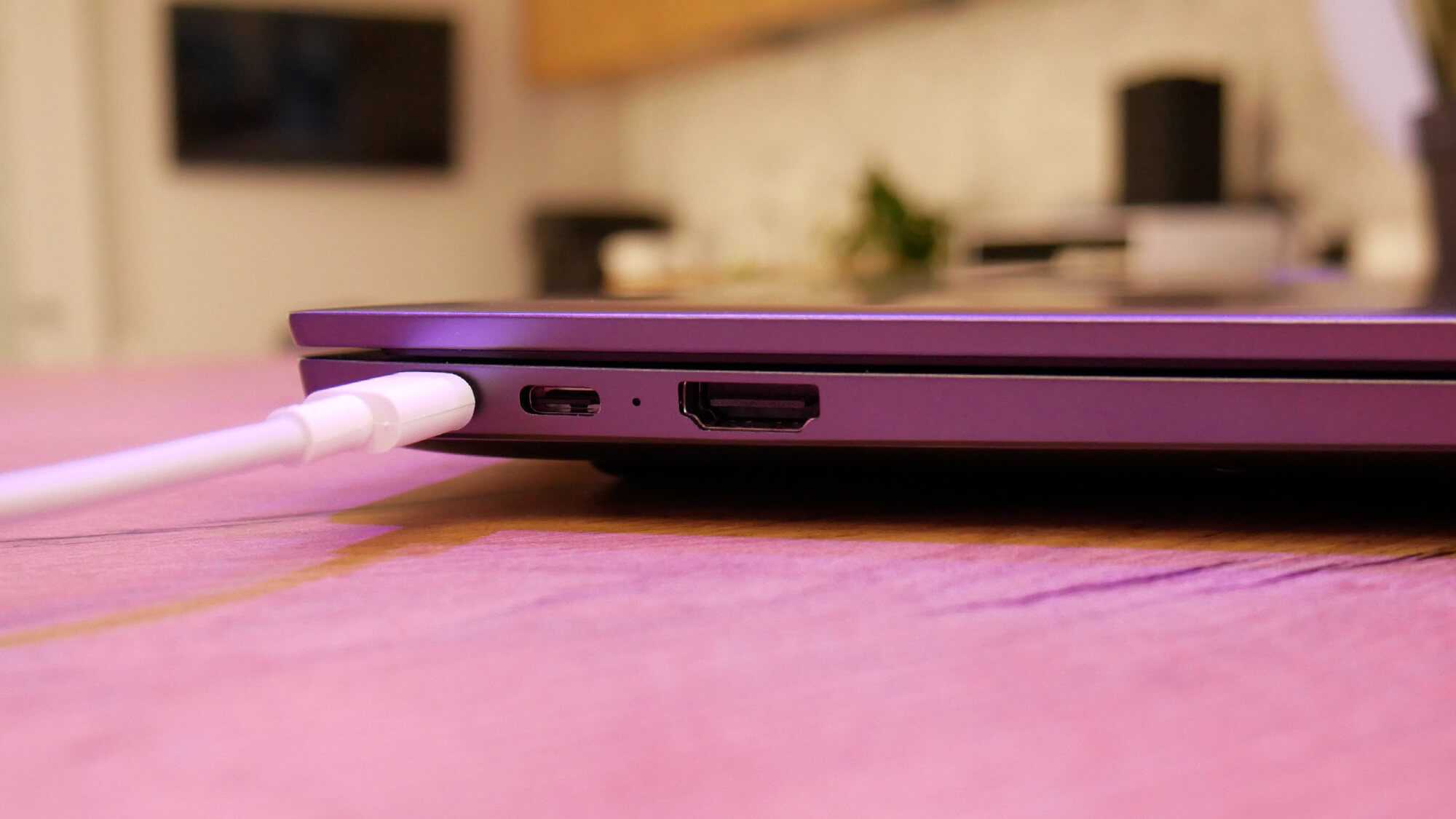 На левом ребре корпуса собрали вместе разъемы USB-C для подключения внешнего устройства или адаптера питания, светодиодный индикатор зарядки, скоростной порт USB-A 3.0 и мультимедийный порт HDMI.