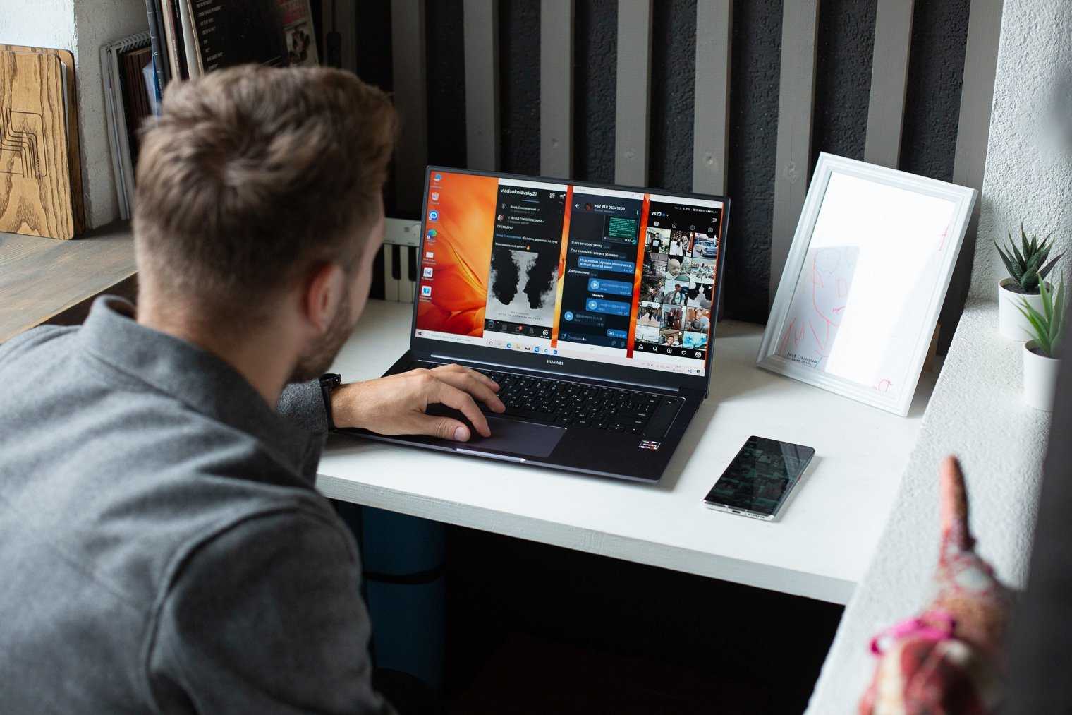 Кроме перечисленных выше функций, есть еще много чего. Даже Huawei Share не ограничивается только выводом экрана смартфона на ноутбук. С помощью этой функции можно еще и передавать фотографии и скриншоты в одно касание, как туда, так и обратно. Достаточно просто коснуться телефоном корпуса ноутбука под клавишами со стрелками.