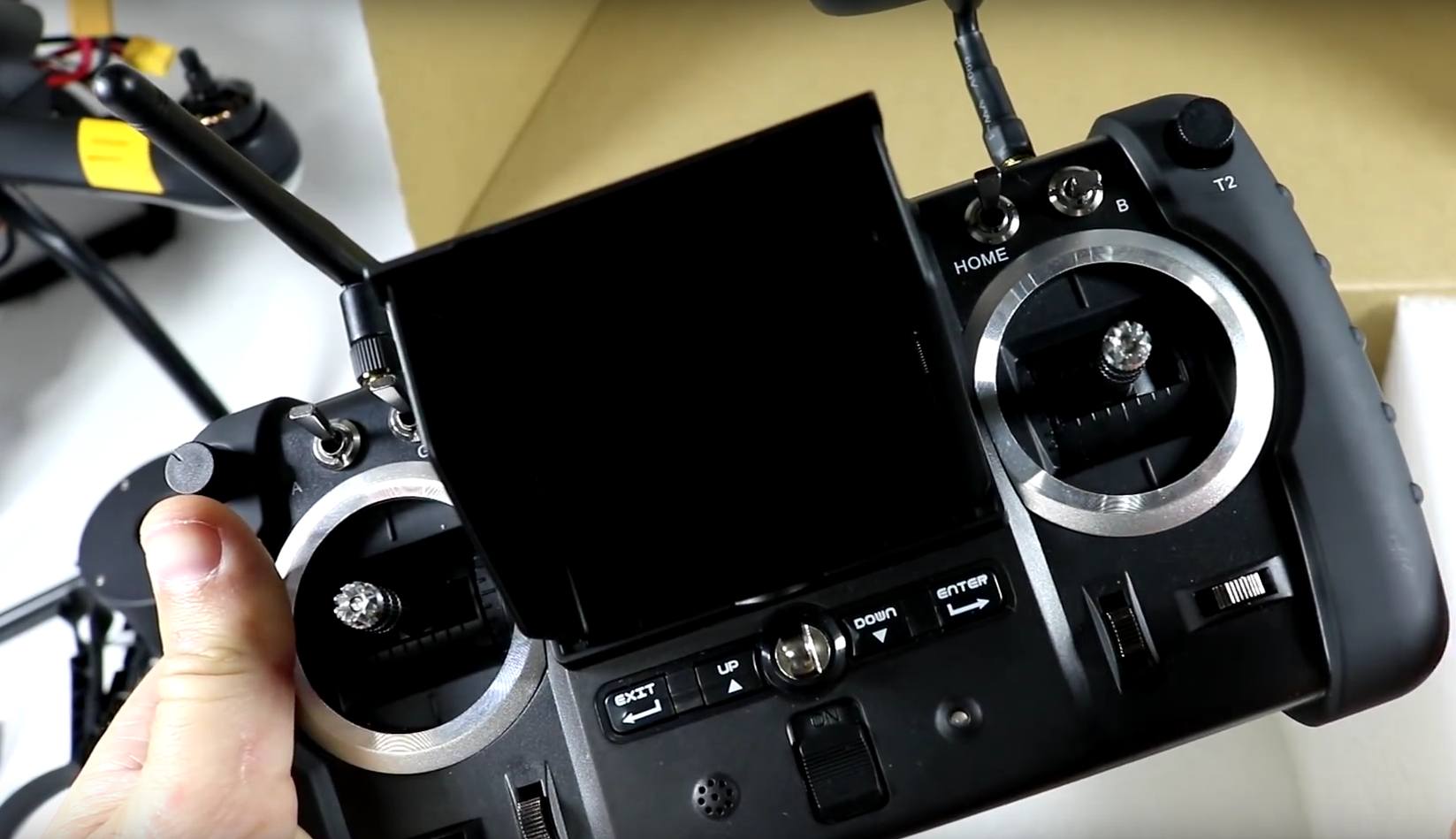 Трансмиттер, поставляемый вместе квадом, имеет вполне классические для этой категории устройств параметры, принимая AV-сигнал на частоте 5,8 ГГц. В его верхней части расположен 4.3-дюймовый LCD-монитор с бликозащитным напылением. В него встроен стандартный GPS-модуль, обеспечивающий плавность передвижения и более-менее высокую точность пространственного позиционирования.
