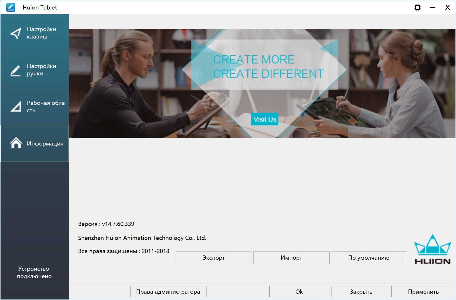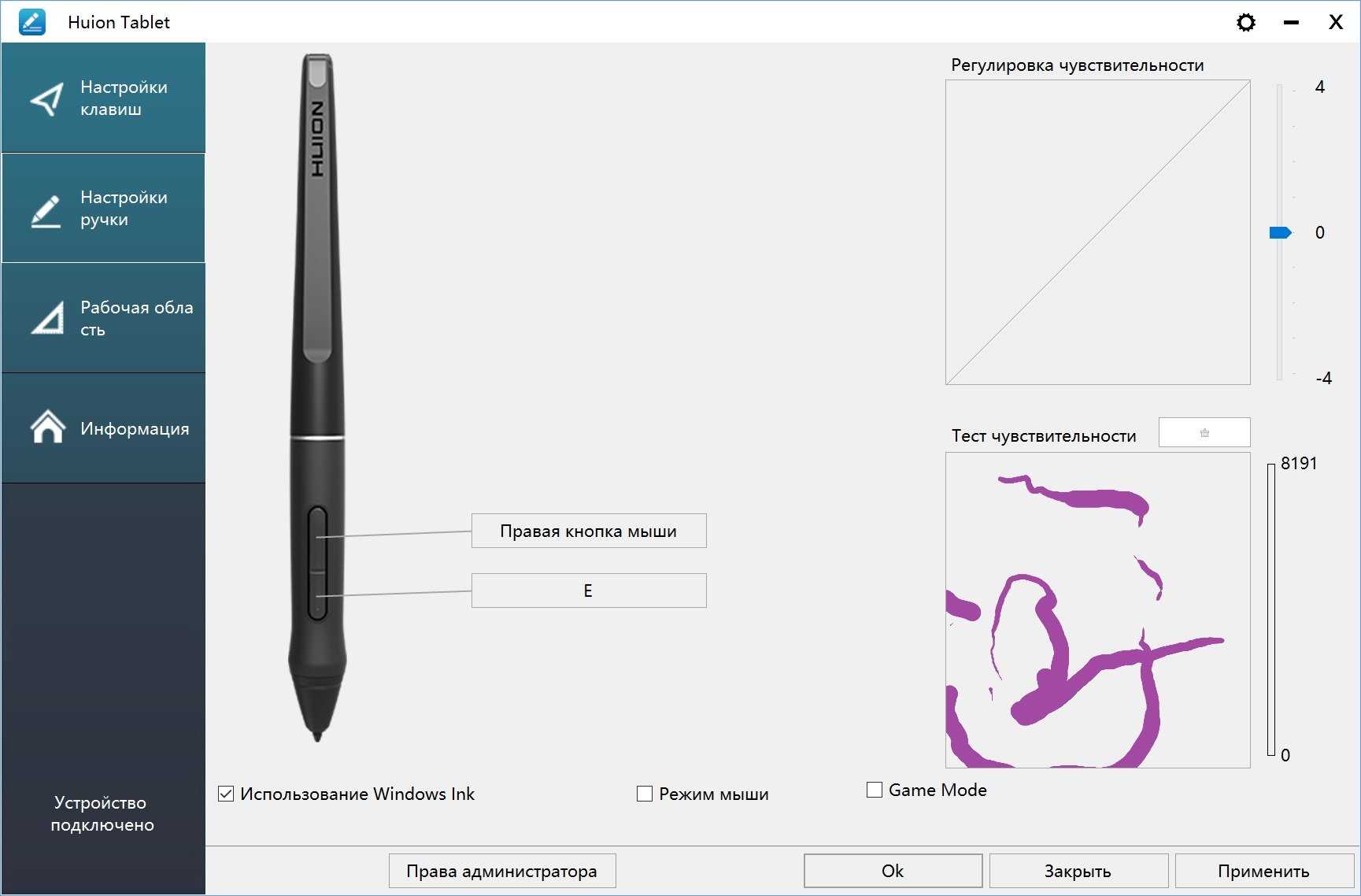 Для полноценной работы с графическим планшетом Huion WH1409 V2 необходимо использовать утилиту Huion Tablet и, как и с другими, ранее рассмотренными планшетам, интерфейс у нее тот же: интуитивно понятный, сделанный на русском языке.
